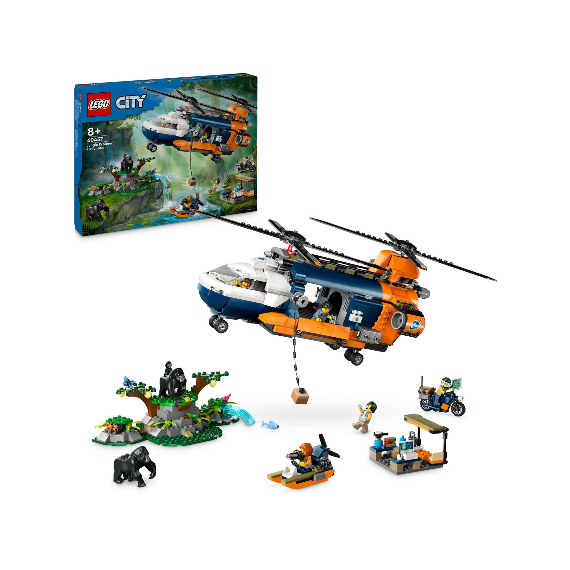 Offrez aux jeunes explorateurs dès 8 ans L’hélicoptère de l’explorateur de la jungle au camp de base LEGO City (60437), incluant un hélicoptère jouet réaliste avec 2 hélices synchronisées, 2 soutes et un treuil fonctionnel. Le set inclut également une moto, un bateau et un camp de base dans la jungle, ainsi que 5 minifigurines d’aventuriers et 3 gorilles, dont un bébé, favorisant la narration et le jeu d'imagination.