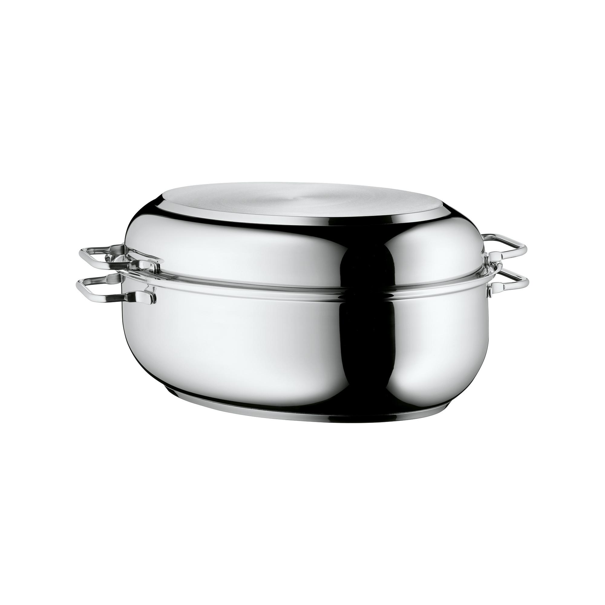Fabriquée en Cromargan® : acier inoxydable 18/10 particulièrement haut de gamme, résistant, facile à entretenir et adapté au lave-vaisselle, la cocotte supplémentaire multifonctionnelle et polyvalente avec couvercle métallique de WMF convainc lors du rôtissage, de la cuisson et du braisage sur chaque cuisinière et également dans le four. D'une part, elle peut être utilisée comme grande rôtissoire, dans laquelle des portions familiales entières de légumes, de volaille ou de rôti peuvent être facilement préparées. D'autre part, le couvercle en métal sert aussi tout simplement de poêle de service pour préparer les plats les plus divers à la poêle et, enfin, pour servir avec style à table. La cocotte et le couvercle sont dotés d'un fond TransTherm® à économie d'énergie, qui permet une répartition et une accumulation optimales de la chaleur.