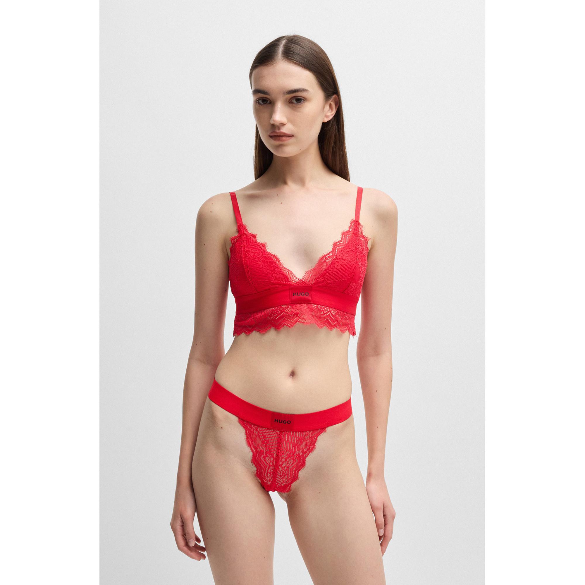 Ce string en dentelle géométrique se distingue par sa taille mi-haute et son étiquette logo rouge à la taille. La ceinture élastique visible offre un confort supplémentaire et un maintien sûr.