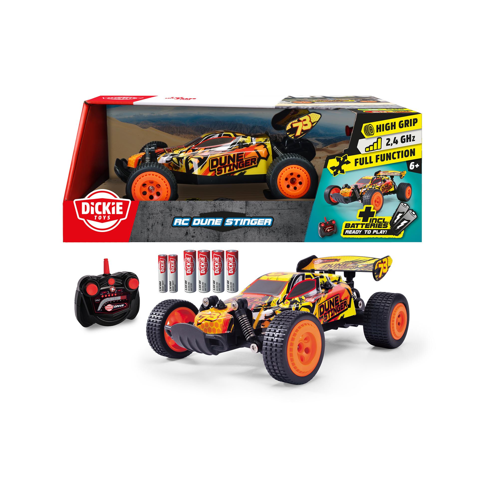 Le buggy tout-terrain maniable « Dune Stinger » est le choix idéal pour des courses de voitures passionnantes ! La suspension intégrée et les pneus en caoutchouc profilés de haute qualité permettent à la voiture-jouet de toujours garder son équilibre et son adhérence - à une vitesse maximale de 12 km/h. En piste et c'est parti : la voiture miniature à piles peut être démarrée directement !