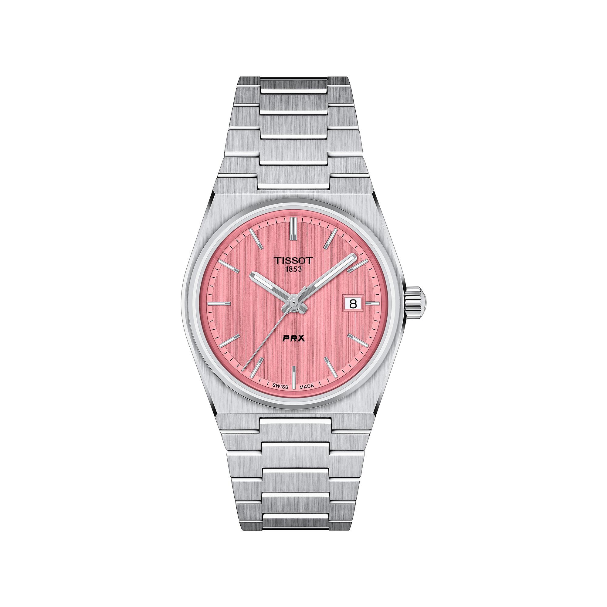 Ce modèle PRX 35mm dispose d'un boîtier en acier inoxydable 316L, d'un cadran rose avec affichage de la date et d'aiguilles et d'index recouverts de matière luminescente SuperLuminova. Le bracelet en acier inoxydable 316L intégré est doté d'un système de changement rapide et d'un fermoir papillon avec poussoirs.