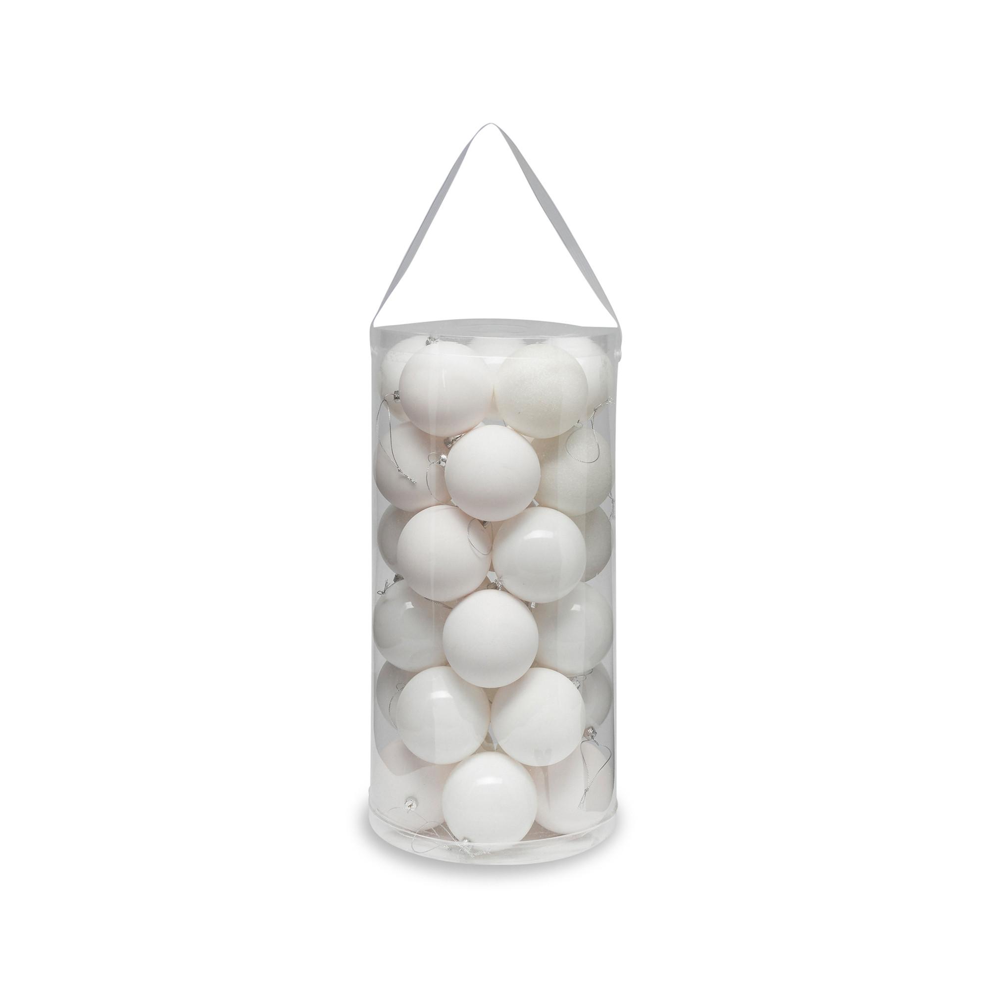 Cet ensemble de boules de Noël de Manor contient trois types de boules différents dans un design monochrome. Les boules sont munies d'une boucle de suspension et sont disponibles en différentes tailles. Les boules de Noël sont en plastique.