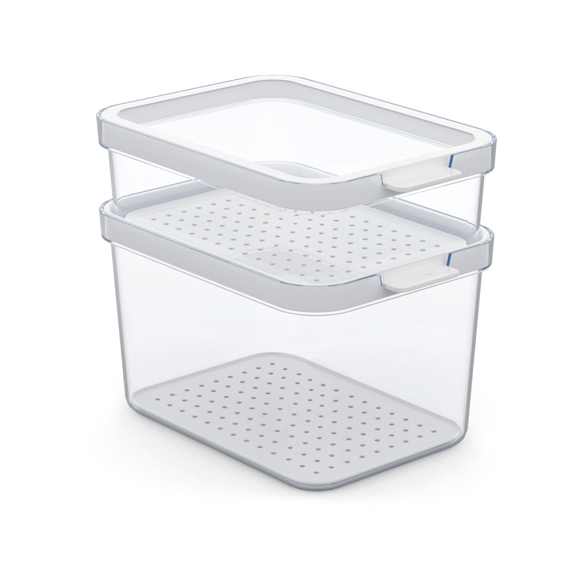 Grâce à la partie inférieure transparente, on a toujours une vue claire sur le contenu et on garde une vue d'ensemble. L'insert amovible avec les trous permet aux liquides de s'écouler, protège les aliments et les garde ainsi frais plus longtemps.