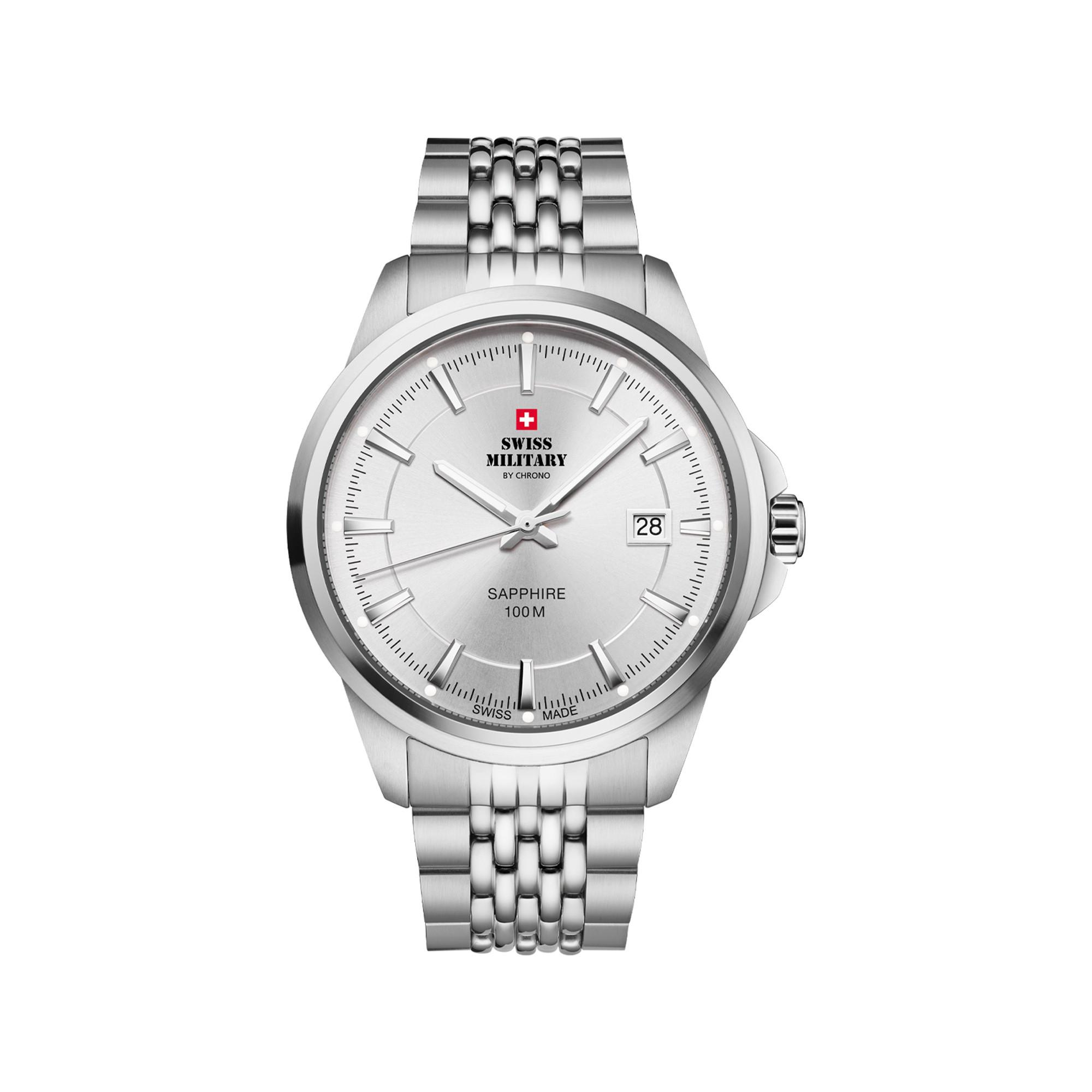 Cette montre pour hommes durable n'est pas seulement un accessoire mode, mais aussi un compagnon fiable et exigeant pour chaque instant. Le design en acier simple a un cadran en argent avec des indexes et des aiguilles classiques. De plus, cette montre pour homme est �quip�e de toutes nos caract�ristiques de qualit�: Swiss Made production maison bo�tier et bracelet en acier inoxydable verre saphir �tanch�it� jusqu'� 100M/10ATM mouvement � quartz suisse