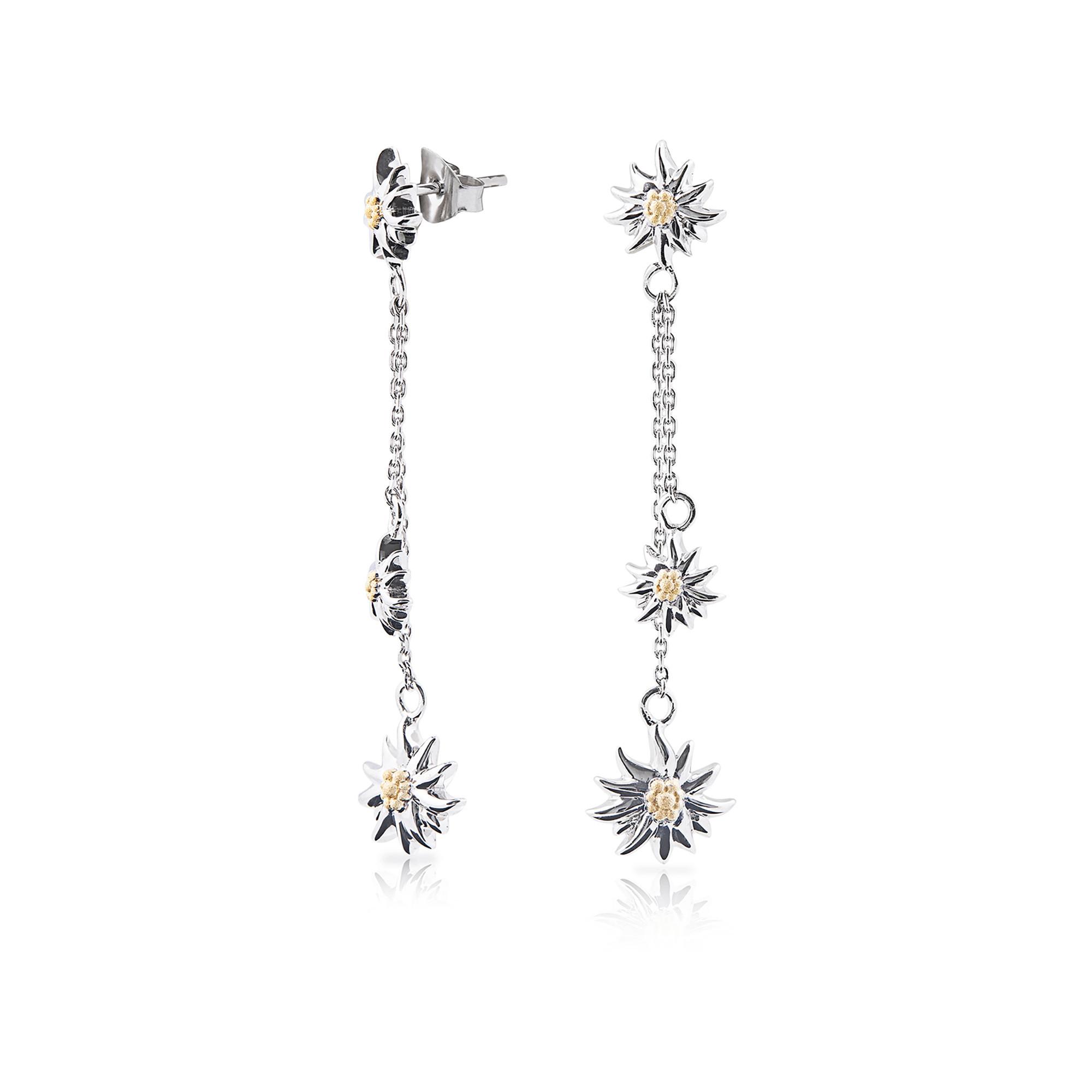 Boucles d'oreilles en argent sterling avec pendentif en edelweiss en bicolore et une cha�ne en satin. L'edelweiss, un symbole de la Suisse et des Alpes, est v�n�r� dans le monde entier pour ses pouvoirs magiques suppos�s.