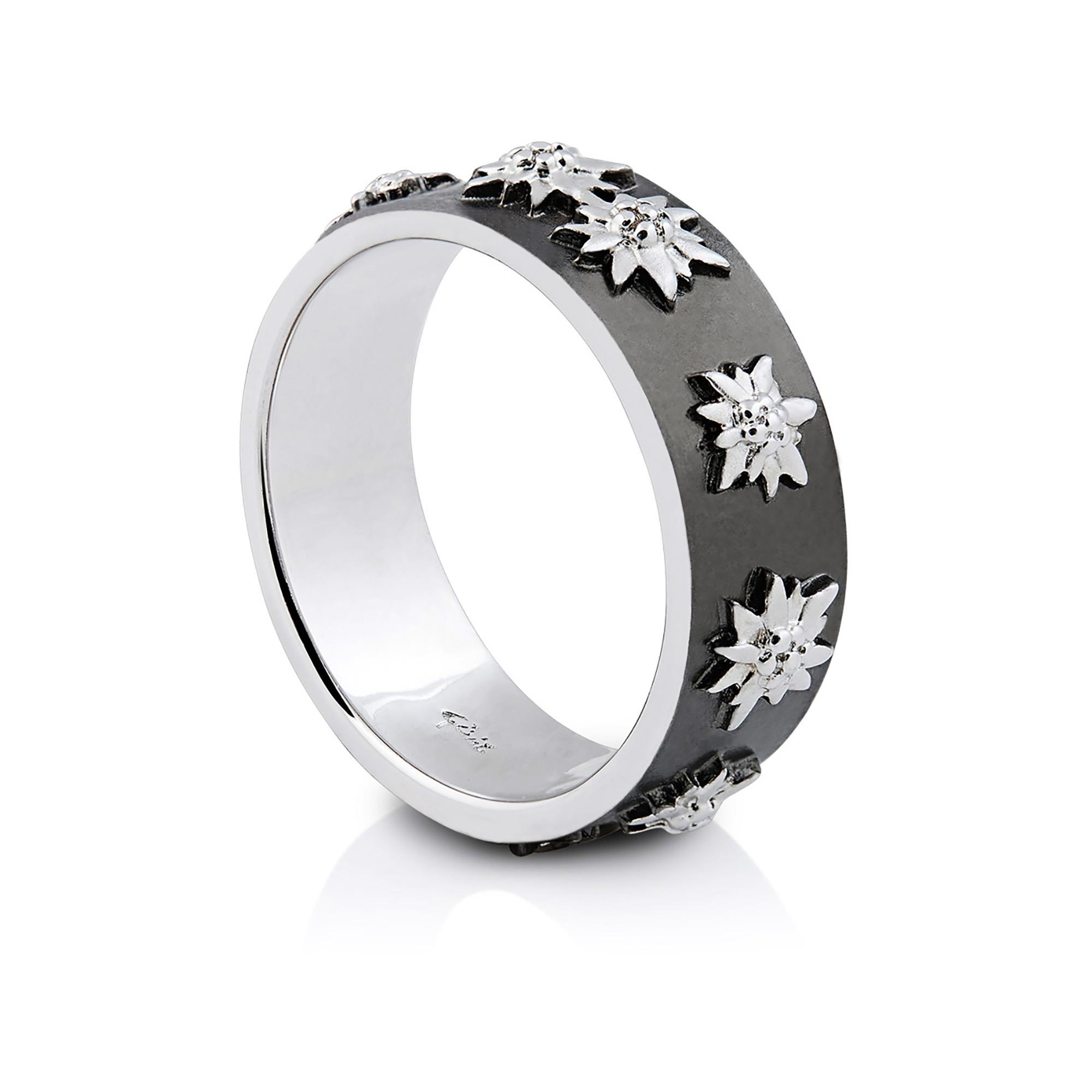 Bague en argent sterling avec un design en edelweiss sur un profil plat, une finition satin�e et du rhodium noir. Un symbole de la culture suisse, de ses symboles et de la beaut� unique des paysages alpins.