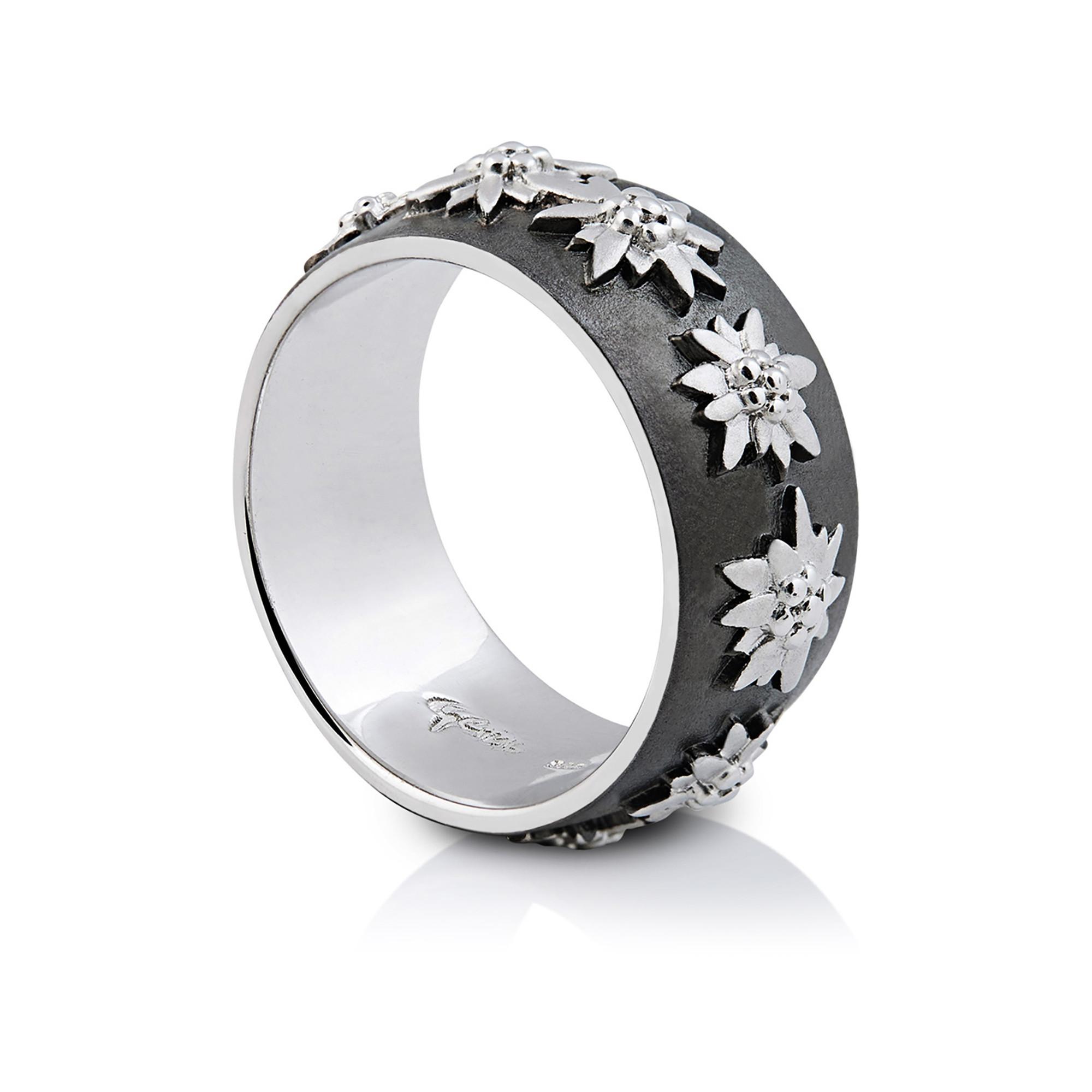 Bague en argent sterling avec un design en edelweiss sur un profil en demi-lune, rhodi�e en noir et avec une finition satin�e. Une expression de la culture suisse, de ses symboles et des paysages alpins � couper le souffle.