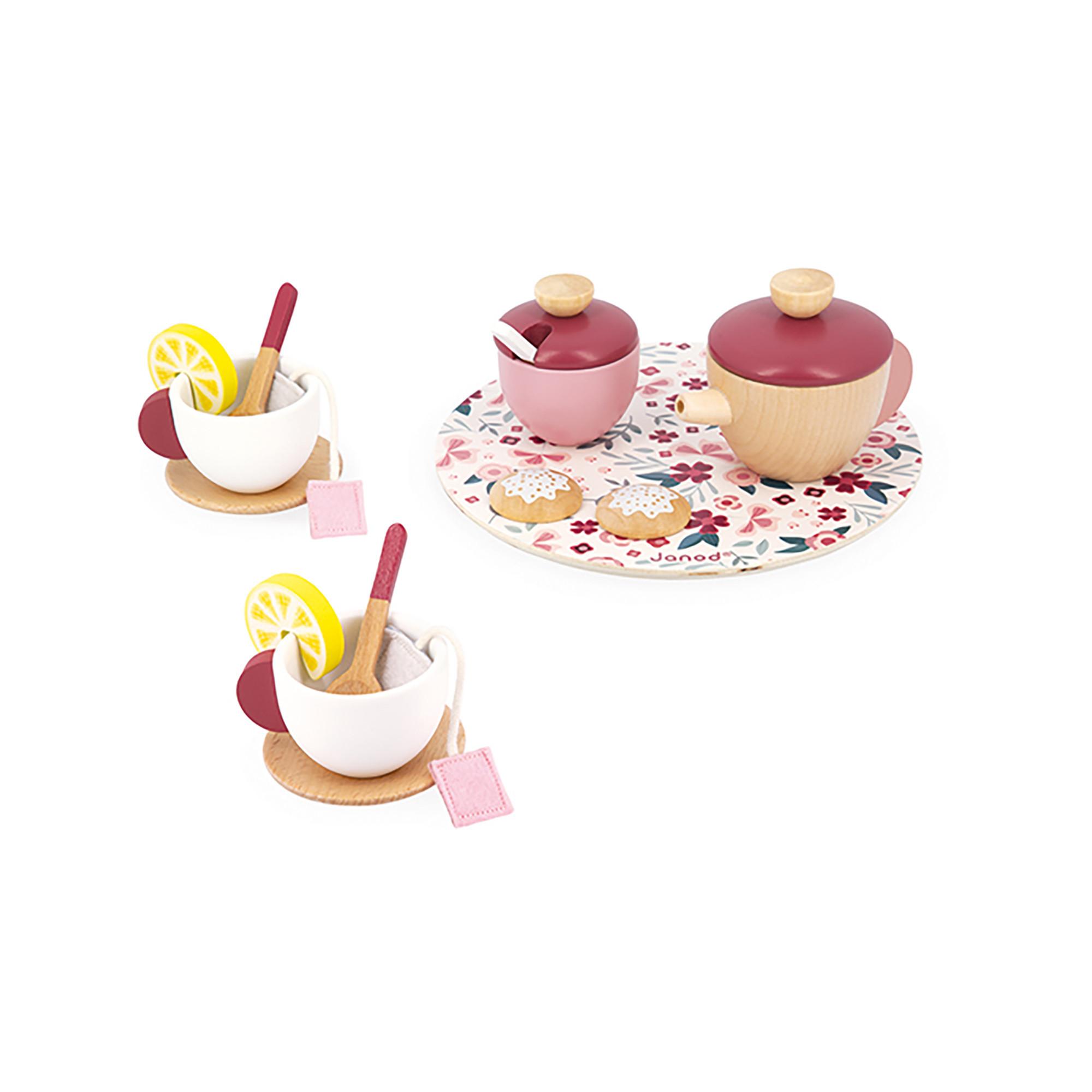 Invitez vos amis à une Tea party avec ce joli service à thé fleuri ! Ce set se compose d’une théière, d’un sucrier, de deux tasses, de deux soucoupes et de trois cuillères en bois. Parce qu’il est important de s’adapter aux goûts de chacun, votre enfant disposera de 2 sachets de thé en feutrine, 2 rondelles de citron et 2 biscuits pour satisfaire ses convives. Ce service est présenté sur un joli plateau en bois aux motifs fleuris. Grâce à ce set à thé, votre enfant développera son imagination ou cherchera à imiter le service des plus beaux salons de thé londoniens. Jouet en bois FSCTM. Jouet d’imitation pour les enfants à partir de 2 ans.