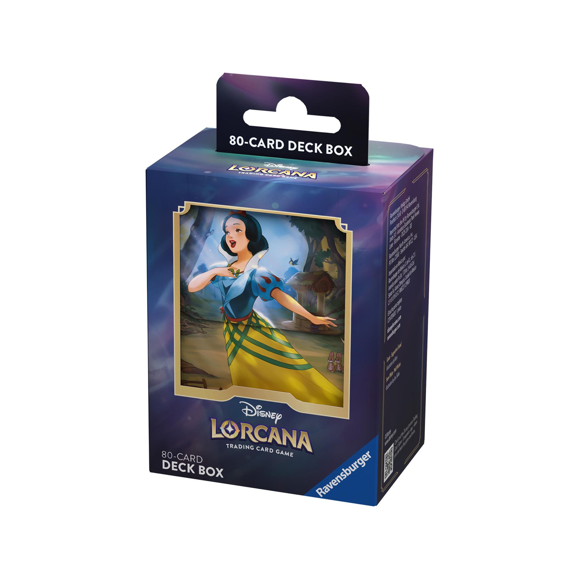 Chaque boîte de rangement Disney Lorcana TCG peut contenir jusqu’à 80 cartes protégées (simple protection). Ces boîtes de rangement Le retour d’Ursula présenteront comme les protège-cartes Blanche-Neige et Genie.