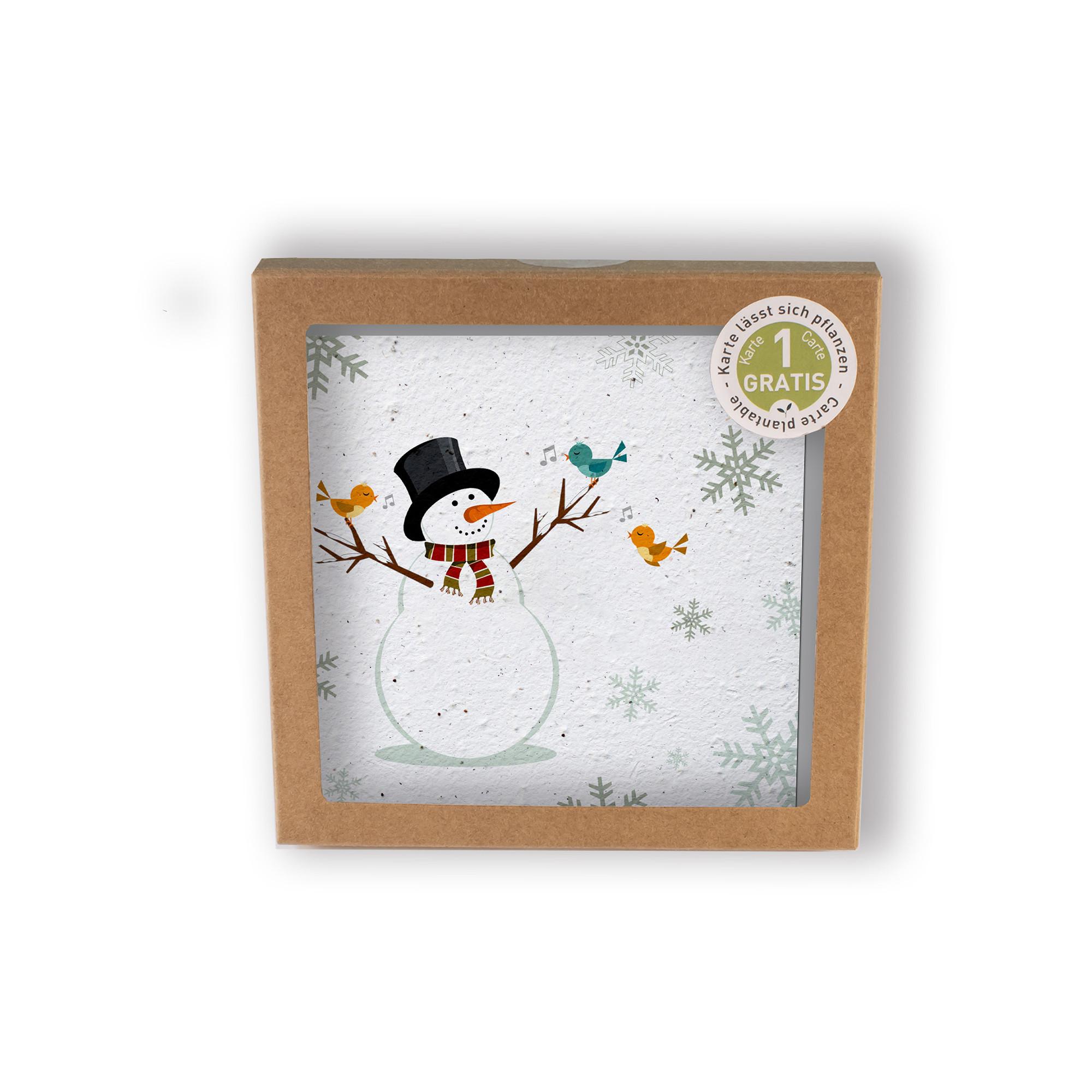 Boîte de cartes 4 x papier ensemencé - modèle : Bonhomme de neige / graines : mélange des herbes