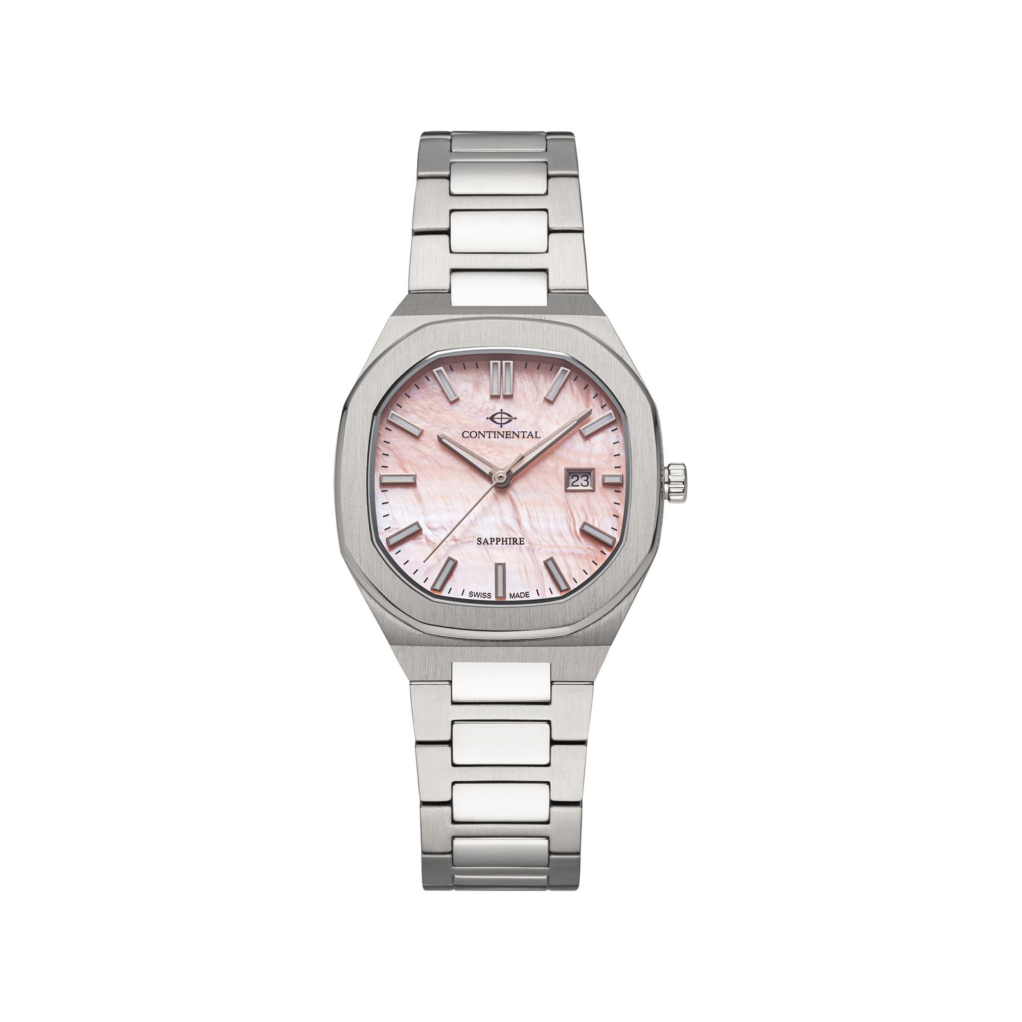 Cette montre pour femmes est dotée d'un boîtier en acier inoxydable d'un diamètre de 32 mm, d'un bracelet en acier inoxydable avec une boucle papillon pliante, d'un cadran rose et d'un verre saphir. Elle est étanche à 50 mètres et est entraînée par le mouvement ETA F04.115.