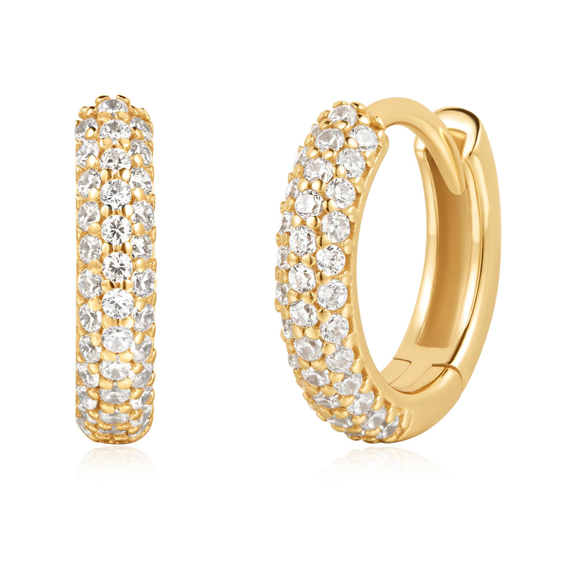 Ces boucles d'oreilles Huggie Hoop en or sont en argent sterling 925 et ornées de pierres de zirconium cubiques plaqués or 14 carats. Elles combinent des pierres scintillantes sur le devant avec de l'argent lisse au dos et sont parfaites pour toutes les occasions et tous les ensembles de boucles d'oreilles.
