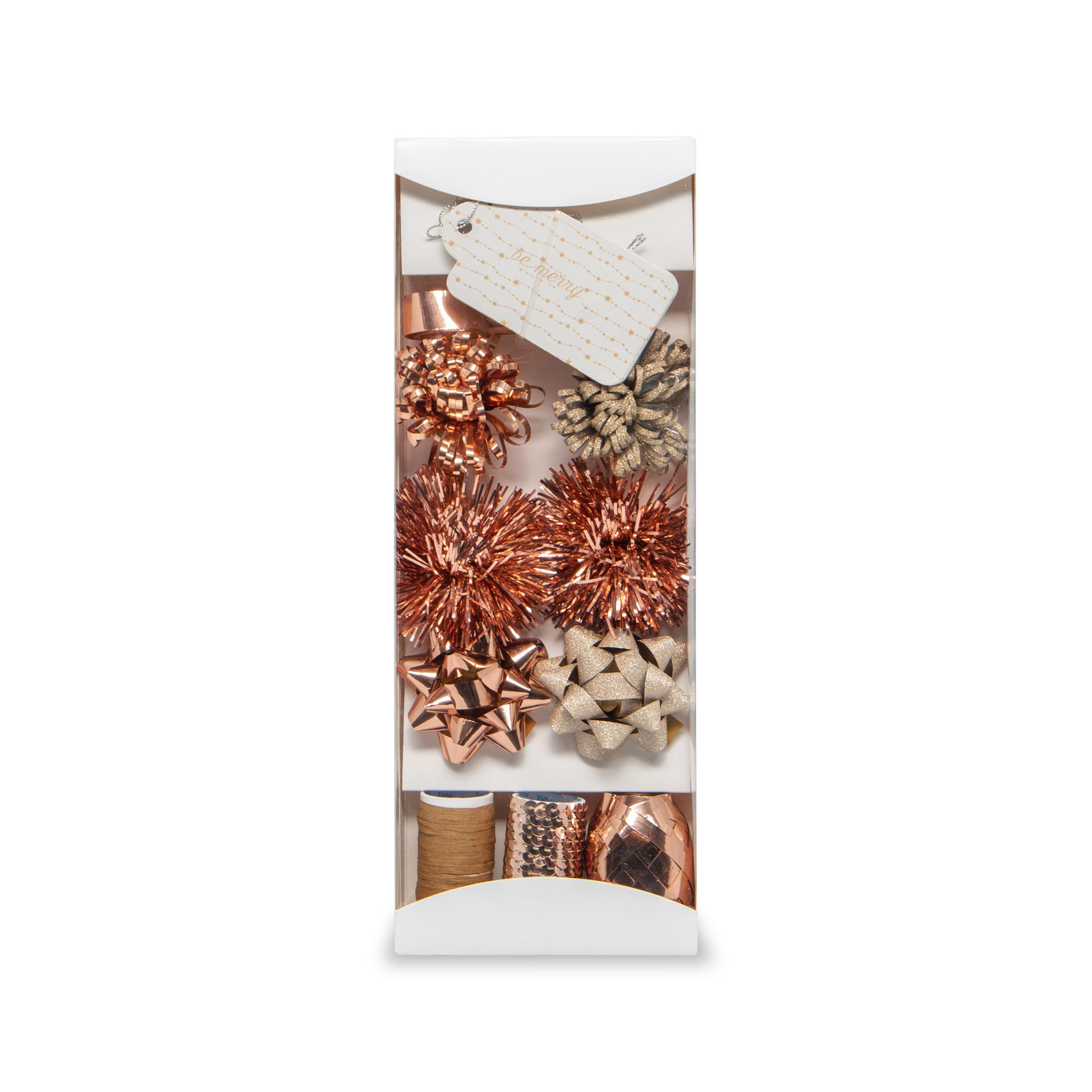 Cet ensemble de Manor contient des décorations, des rubans et des étiquettes assortis dans différents matériaux et couleurs qui donnent la touche finale aux cadeaux.