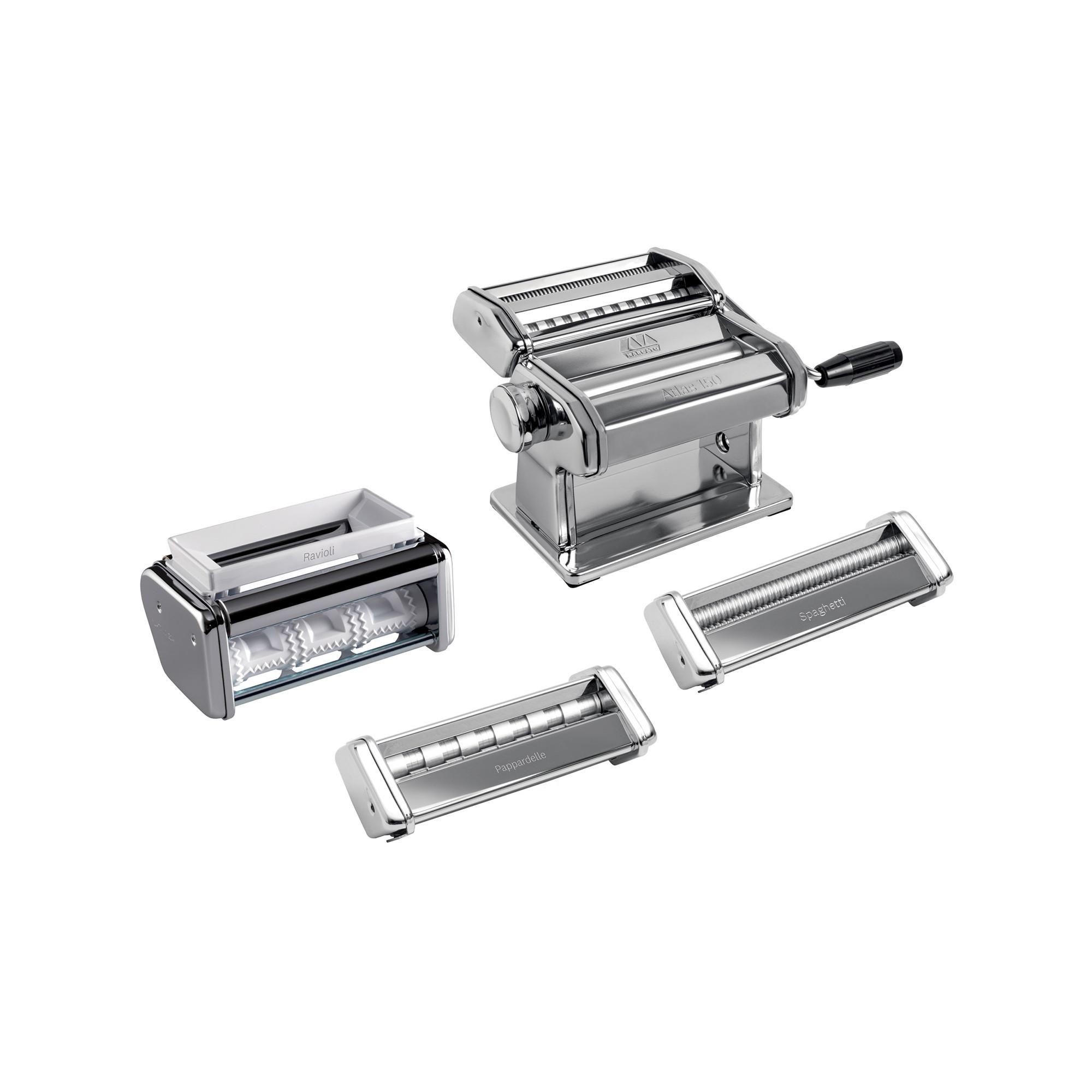 Le kit Multipast contient Atlas 150 et 3 accessoires pour faire des raviolis, des spaghettis et des pappardelles. Atlas est fabriqué en acier chromé avec des rouleaux en aluminium anodisé. Les peignes et les raclettes sous les rouleaux sont amovibles pour permettre un nettoyage complet. La machine est stable et rapide dans le traitement de la pâte en 10 épaisseurs différentes. Grâce à la fermeture à baïonnette sur le côté de la machine, vous pouvez facilement connecter le moteur Pastadrive pour travailler librement avec les deux mains.