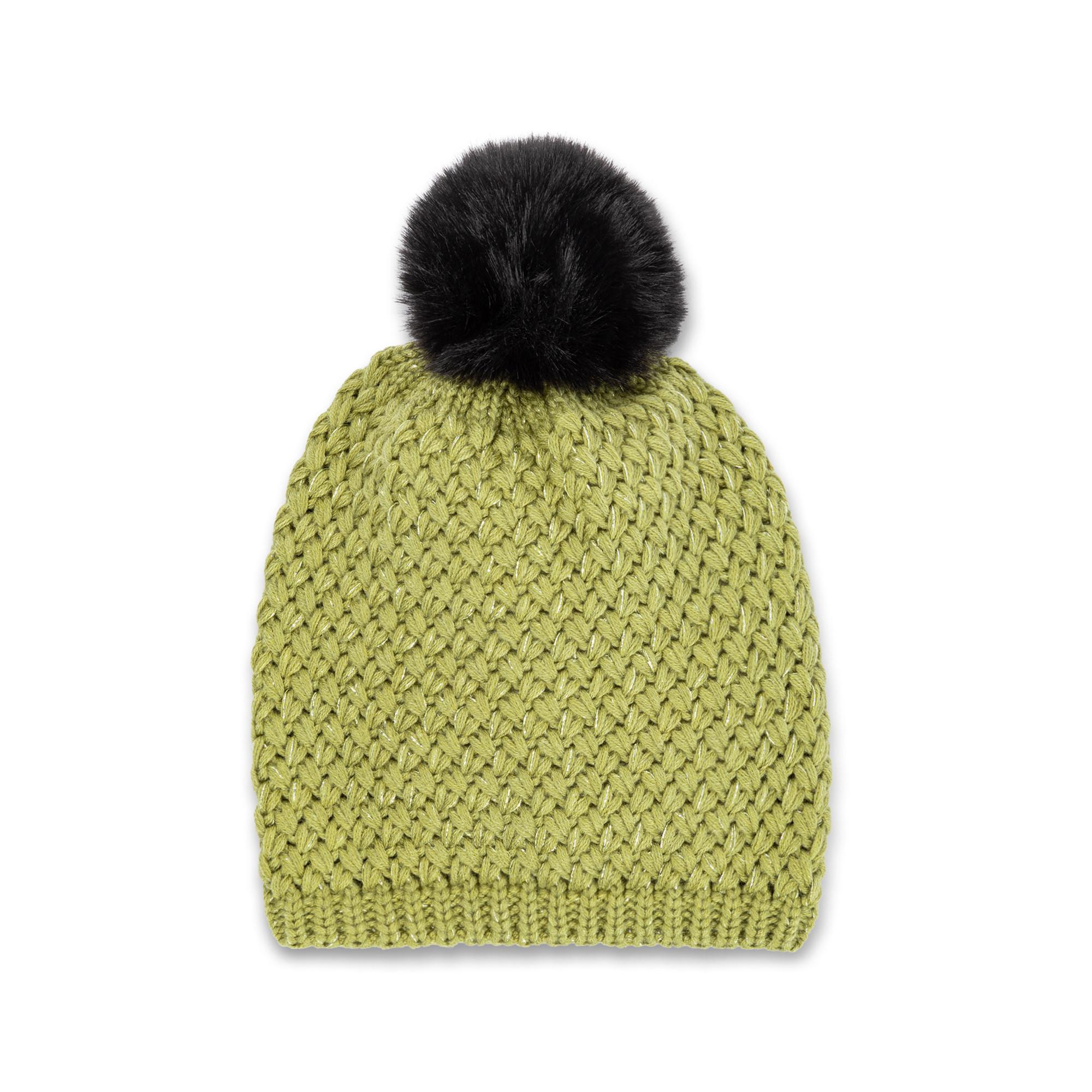 Ce bonnet en tricot de Manor Sport en tricot grossier avec des fils brillants et un pompon en fourrure est un accessoire tendance pour les activités de plein air pendant la saison froide.