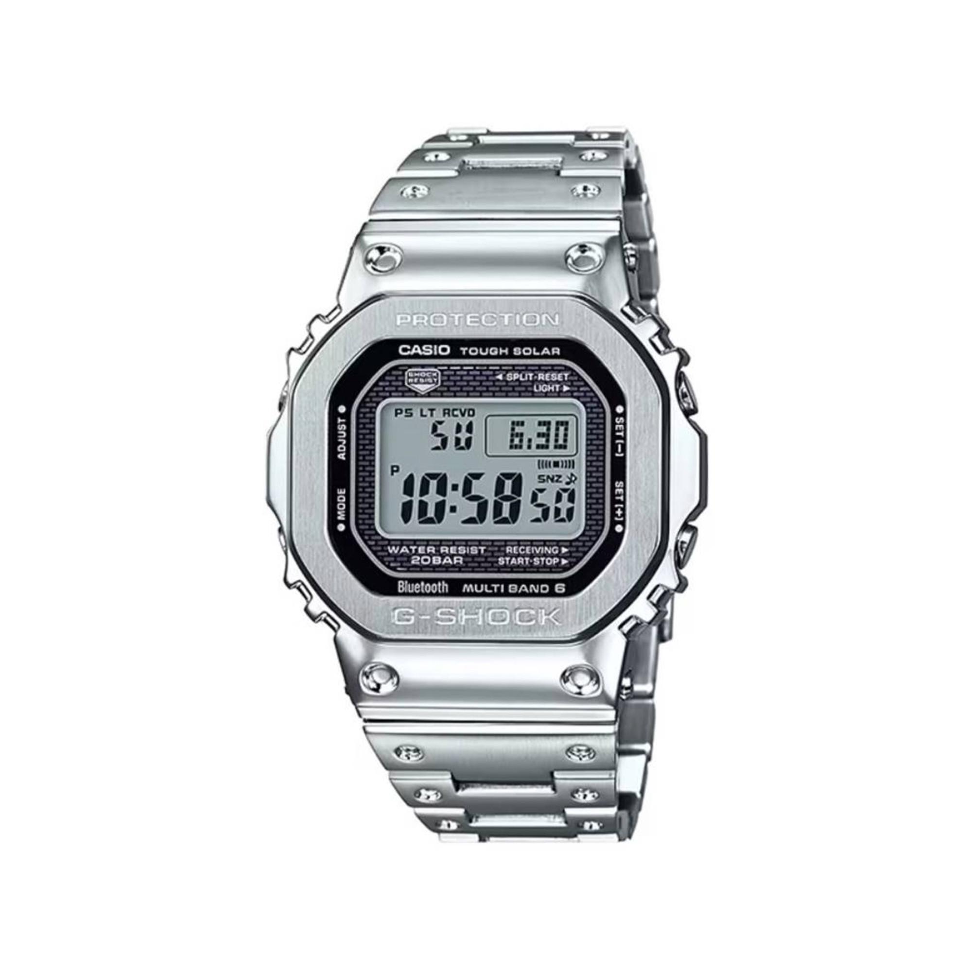 La G-SHOCK GMW-B5000D-1ER de Casio allie robustesse classique et technologie moderne. Le boîtier et le bracelet en acier inoxydable poli à haute brillance, ainsi que la lunette matte, confèrent à la montre un look élégant. Avec des fonctions telles que la connexion Bluetooth®, la réception du signal horaire par radio, l’énergie solaire et une étanchéité jusqu’à 200 m, cette montre est un véritable atout, tant sur le plan technique qu’esthétique.