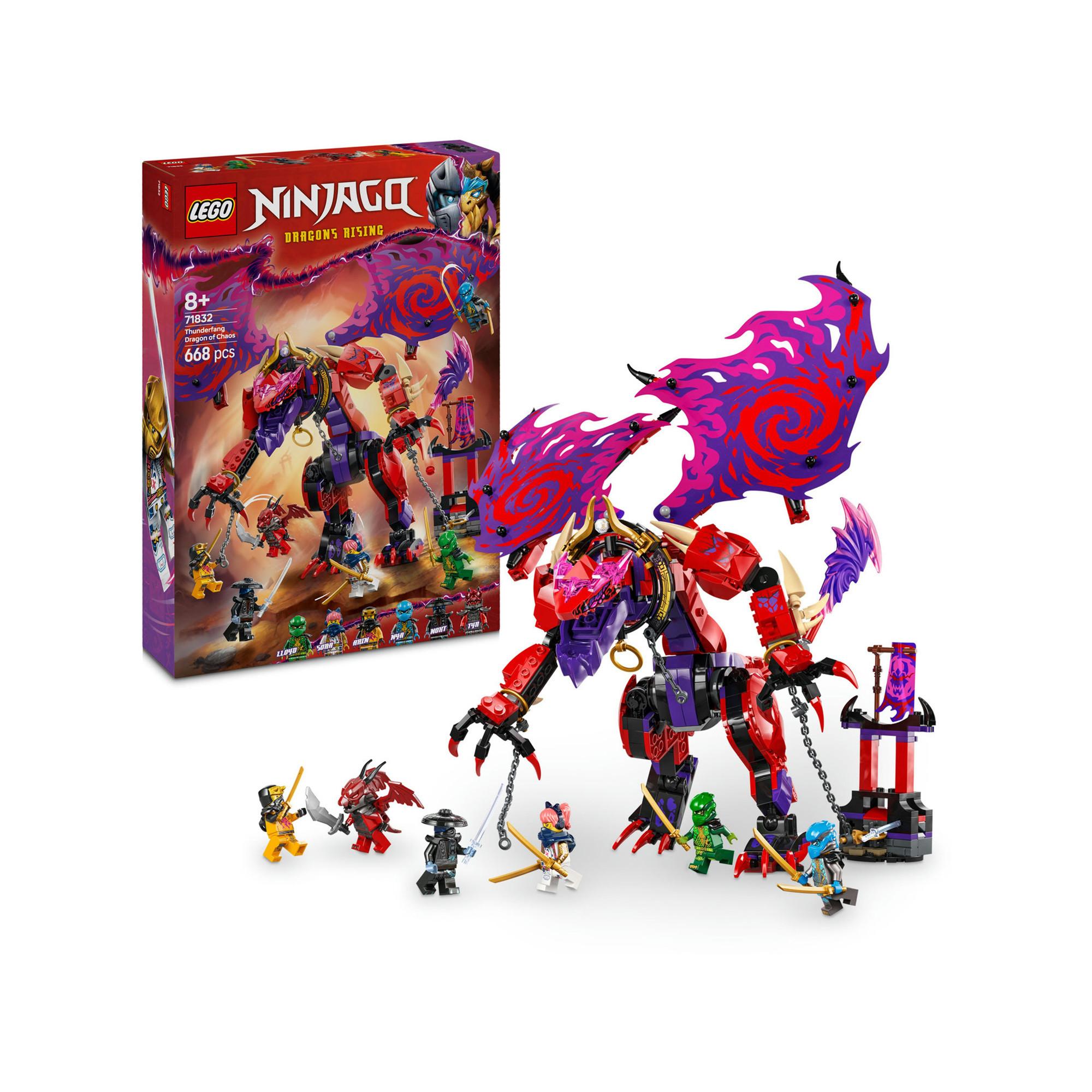 Croc-de-tonnerre : le dragon du chaos LEGO® NINJAGO® (71832) invite les garçons et les filles dès 8 ans à recréer l’action de la saison 3 de la série TV NINJAGO Le soulèvement des dragons. Ce set inclut un grand dragon avec une queue, des pattes, des ailes, des pieds, une tête et une mâchoire articulés, et un canon à tenons sous chaque aile. Le dragon est enchaîné à une petite construction et peut être libéré avec les 2 lames prismatiques.