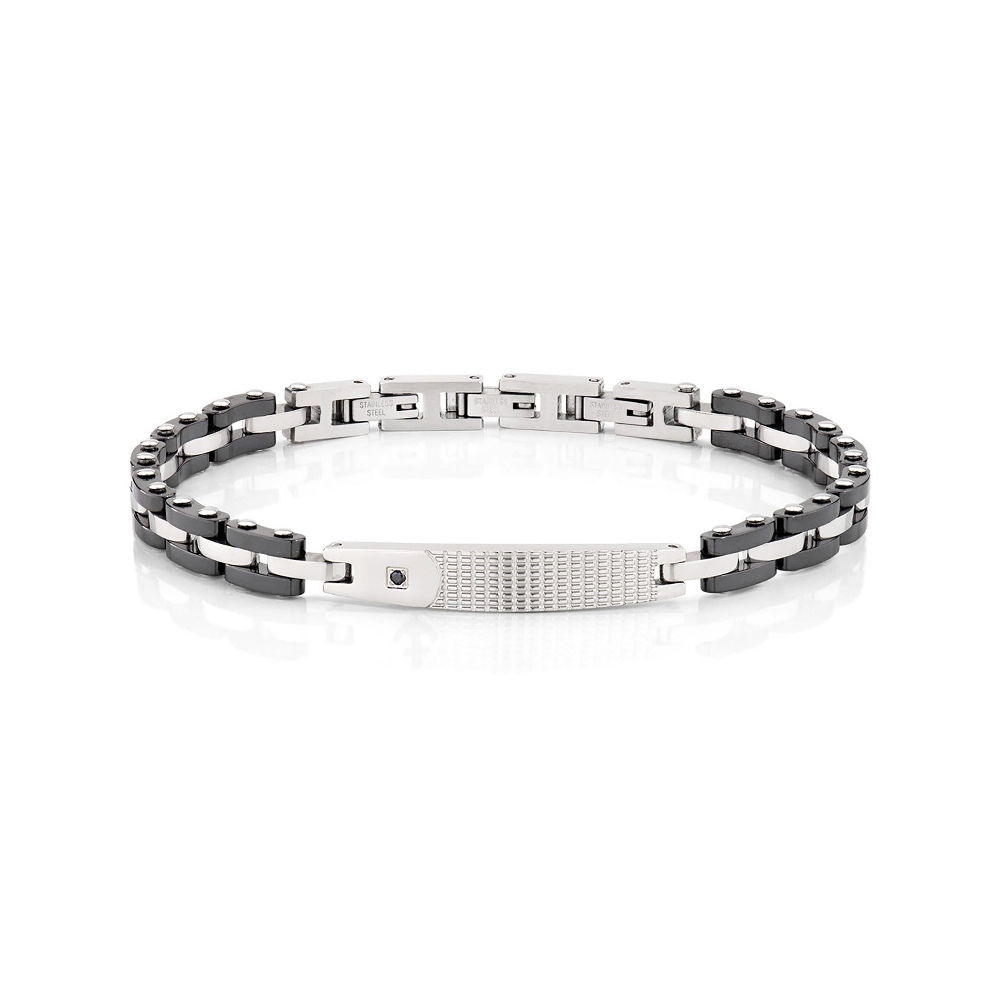 Ce bracelet pour homme en acier inoxydable et céramique se distingue par sa surface en acier brillant et ses précieux diamants noirs. Avec un poids de 23 g, il allie luxe, robustesse et style masculin.