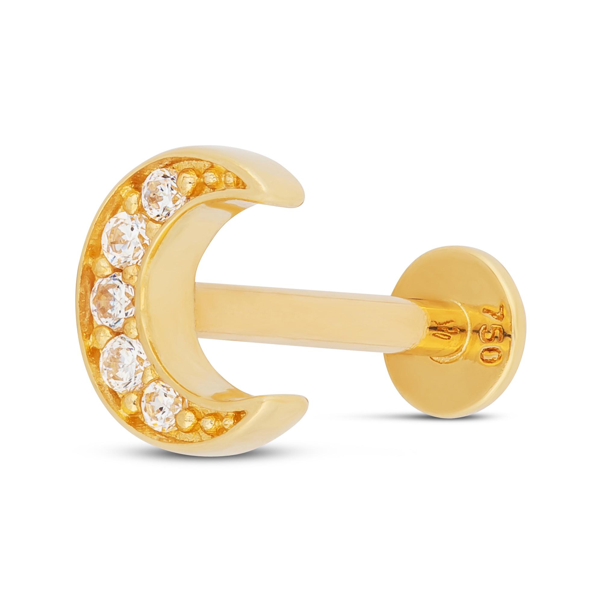 Ce piercing de Studio Marquise en or jaune est un bijou distinctif. Le clou représente un croissant de lune serti de zirconium et a un bouchon à vis avec un dos plat.