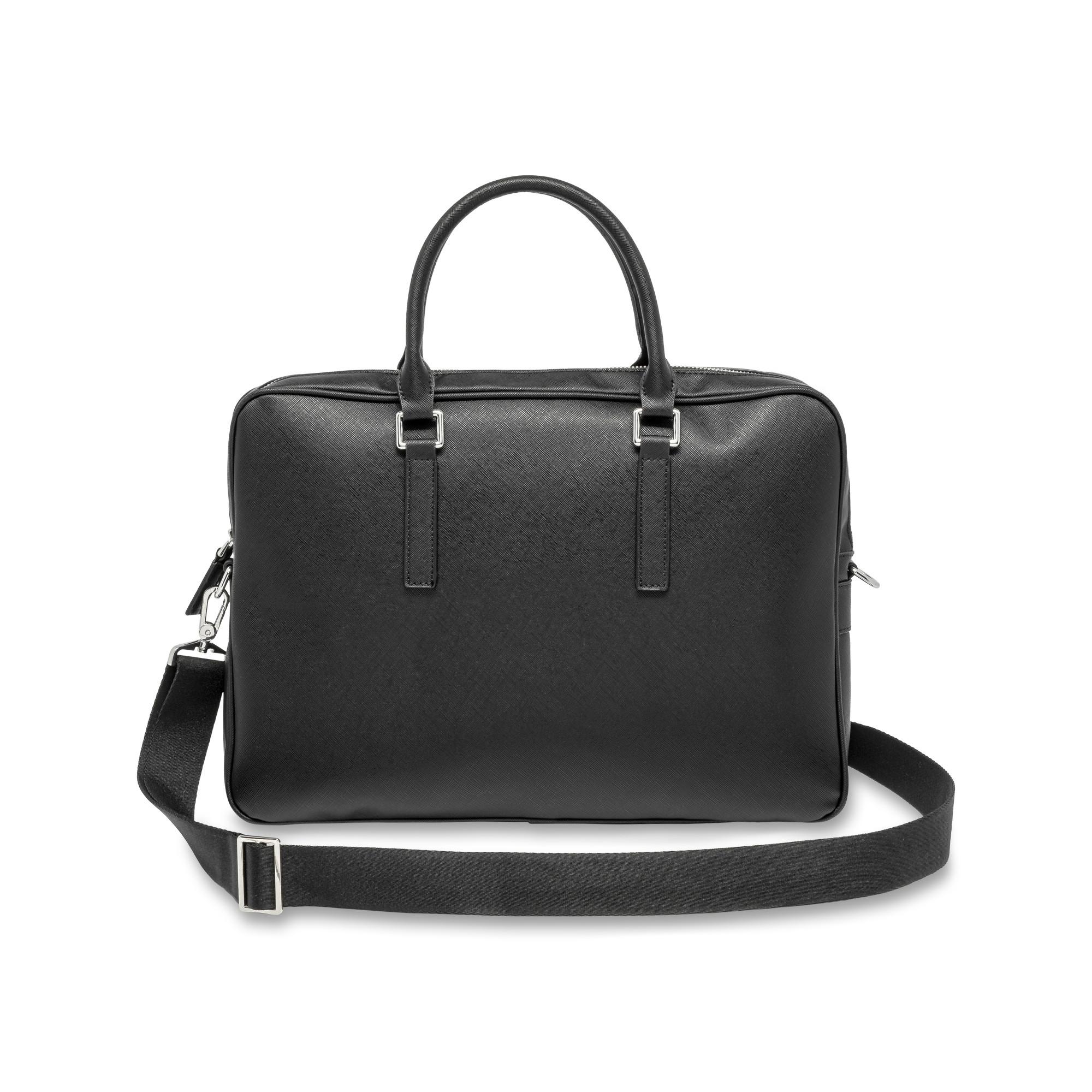 Ce sac pour ordinateur portable en imitation cuir aspect saffiano est un accessoire quotidien élégant avec une touche sportive grâce à la bandoulière amovible et variable en longueur. Il a également des poignées de transport et est équipé d'un compartiment intérieur rembourré pour ordinateur portable et tablette et d'un compartiment à fermeture à glissière pour le matériel d'écriture et autres petites choses importantes.