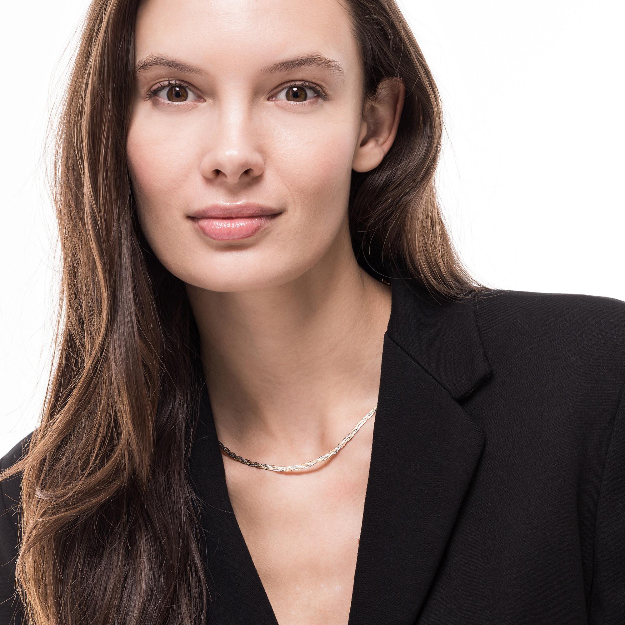 Ce collier de L'Atelier Gold 18 Karat by Manor est en or doré et or rose. La chaîne tressée repose à plat et peut être fermée avec style par un fermoir à mousqueton.