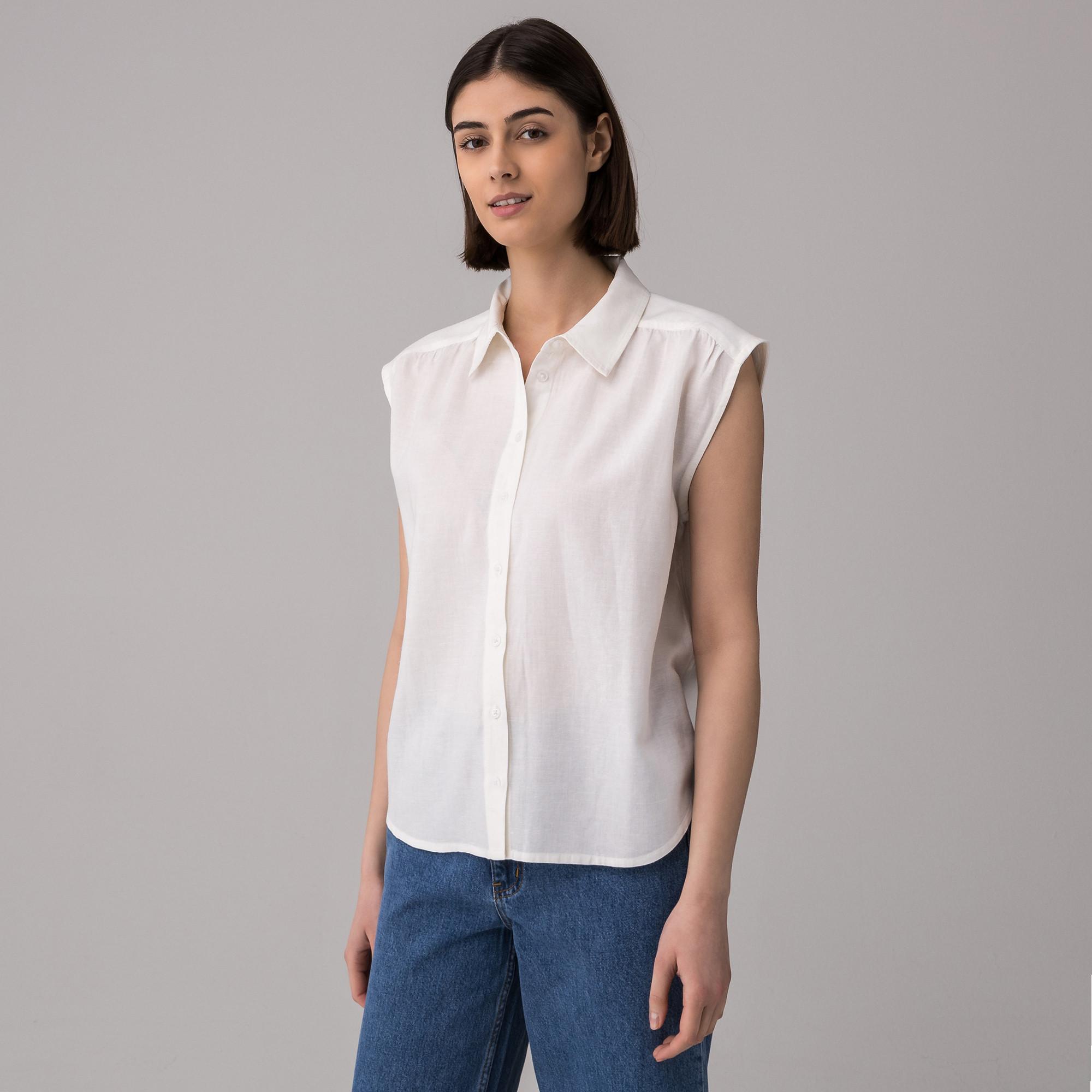 Ce chemisier en lin est un haut polyvalent avec le potentiel de devenir un favori grâce à sa coupe féminine et ses fronces discrètes sur les épaules et le dos. Il a un col rabattu étroit, des manches courtes coupées et un ourlet arrondi.