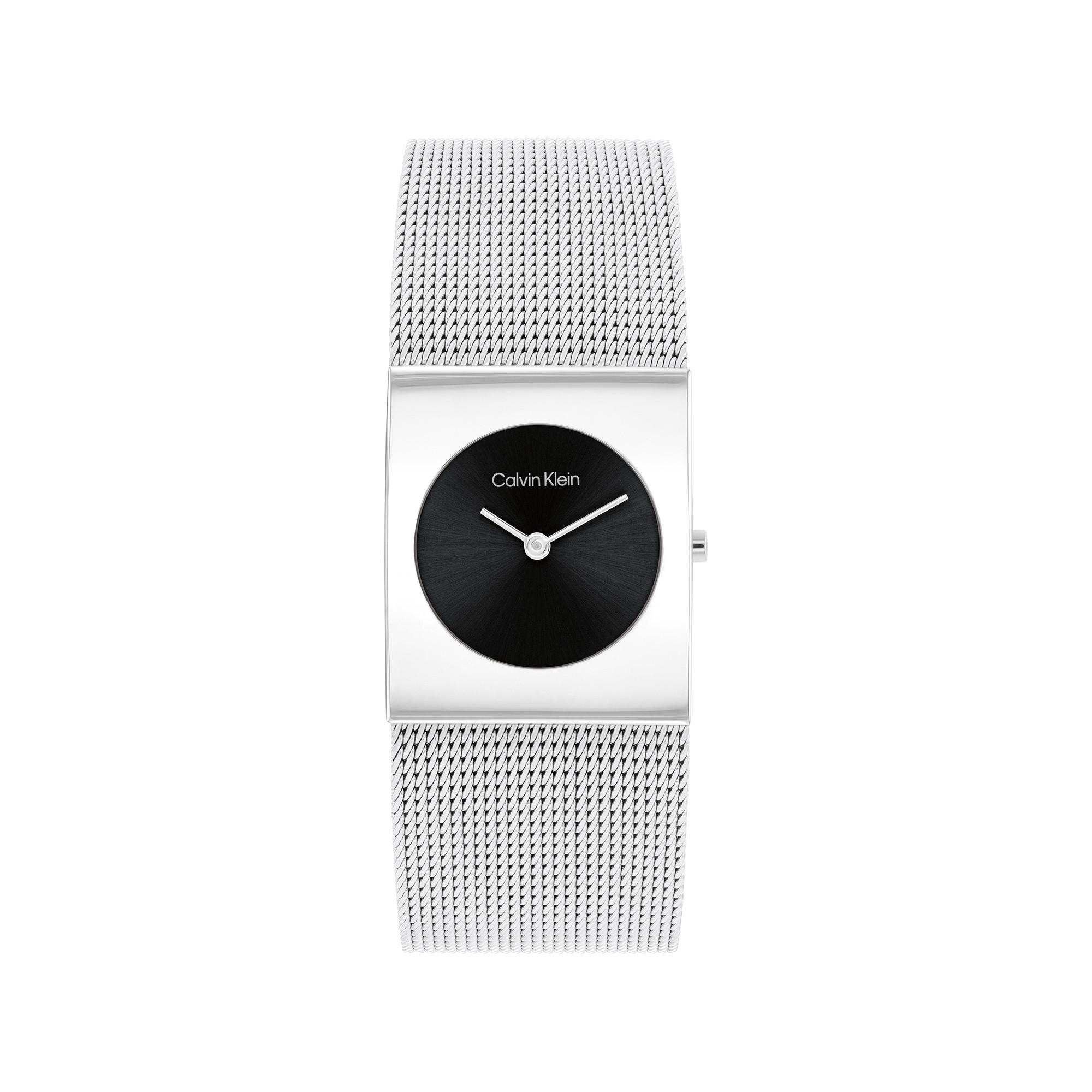 Cette montre de Calvin Klein se distingue par un design minimaliste avec un cadran noir et des aiguilles argentées pour les heures et les minutes. Le cadran est encadré par un boîtier en acier inoxydable de forme géométrique, complété par un bracelet en maille d'acier inoxydable. La montre est résistante aux éclaboussures et dotée d’un mouvement à quartz précis.
