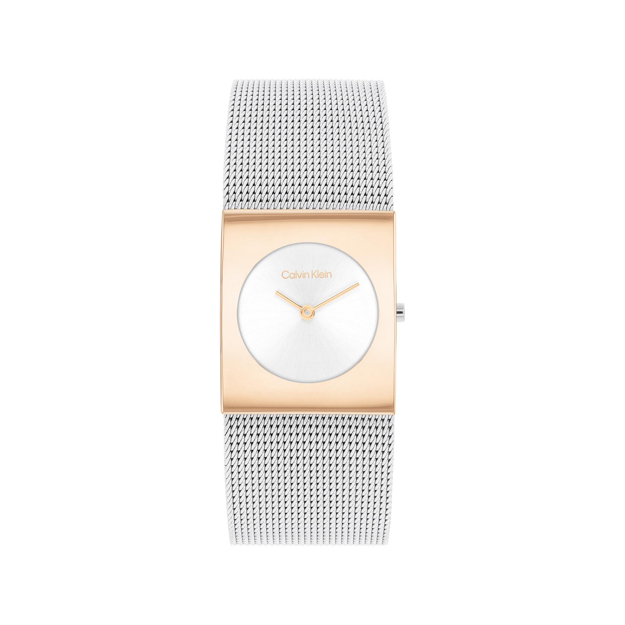 Cette montre de Calvin Klein se distingue par un design minimaliste avec un cadran argenté et des aiguilles rose doré pour les heures et les minutes. Le boîtier géométrique en acier inoxydable de ton rose doré est complété par un bracelet en maille d'acier inoxydable. La montre est résistante aux éclaboussures et dotée d'un mouvement à quartz précis.