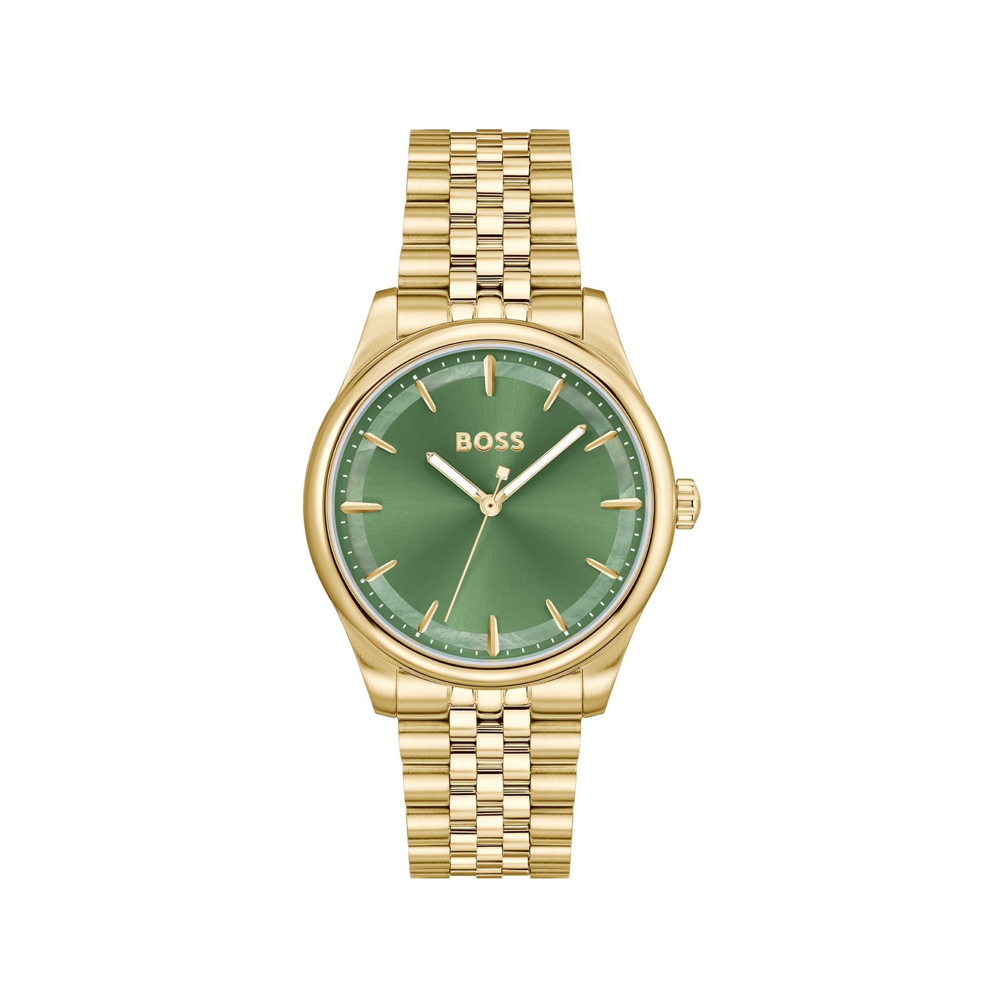 Cette montre pour femme Boss «Graceful» allie élégance délicate et fabrication de haute qualité. Le boîtier rond en acier inoxydable entoure un cadran vert qui dégage une sophistication intemporelle grâce à des index clairs. Le bracelet en acier inoxydable doré avec fermoir déployant assure un grand confort de port, tandis que l'étanchéité jusqu'à 30 mètres la rend parfaitement adaptée à la vie quotidienne.