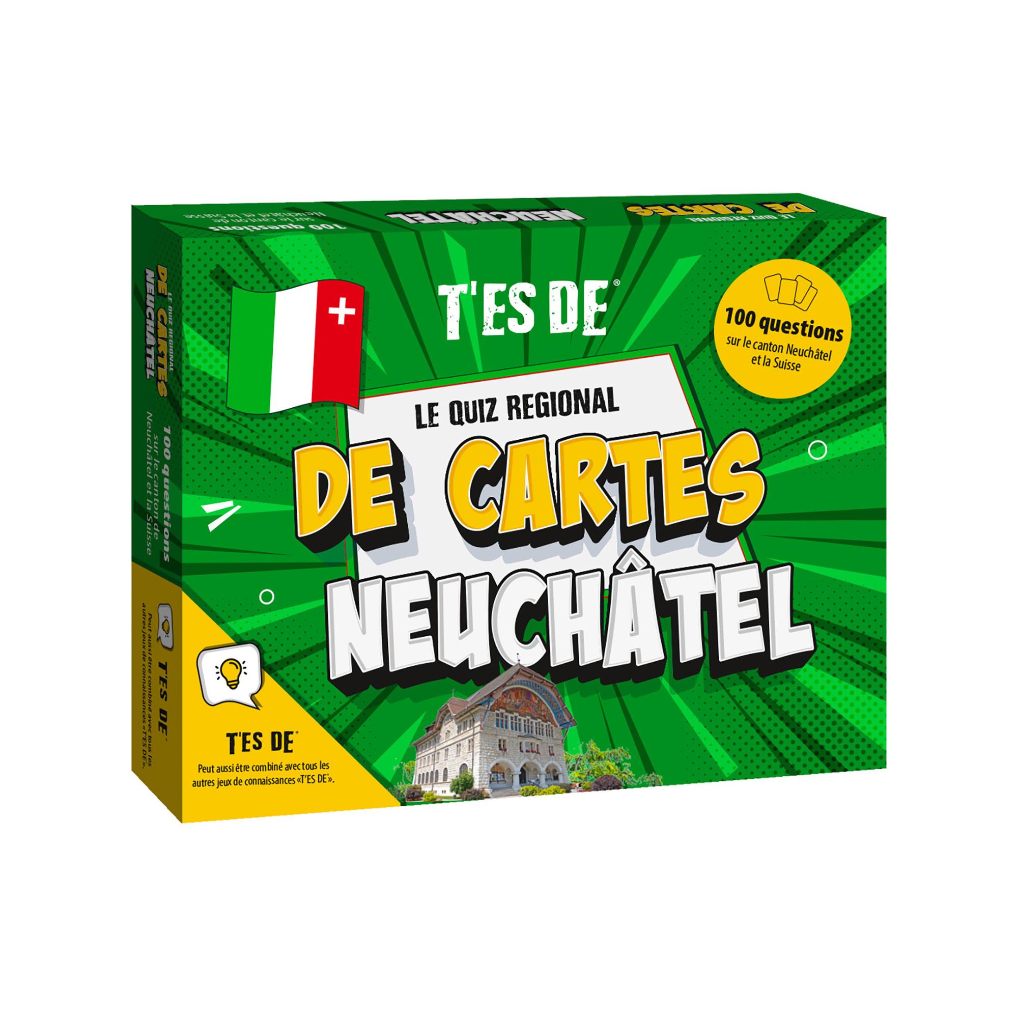 Défie tes amis et ta famille avec 100 questions sur l’histoire, la géographie, la culture, la politique, le sport et les attractions touristiques du canton de Neuchâtel et la Suisse. Jusqu’à 4 personnes peuvent se poser des questions passionnantes, classées selon différents niveaux de difficulté. Un jeu amusant et instructif, idéal aussi en voyage. Le jeu de questions Neuchâtel convient aussi parfaitement comme extension du jeu «T’ES DE®» Neuchâtel si – le jeu de connaissances de ta région.