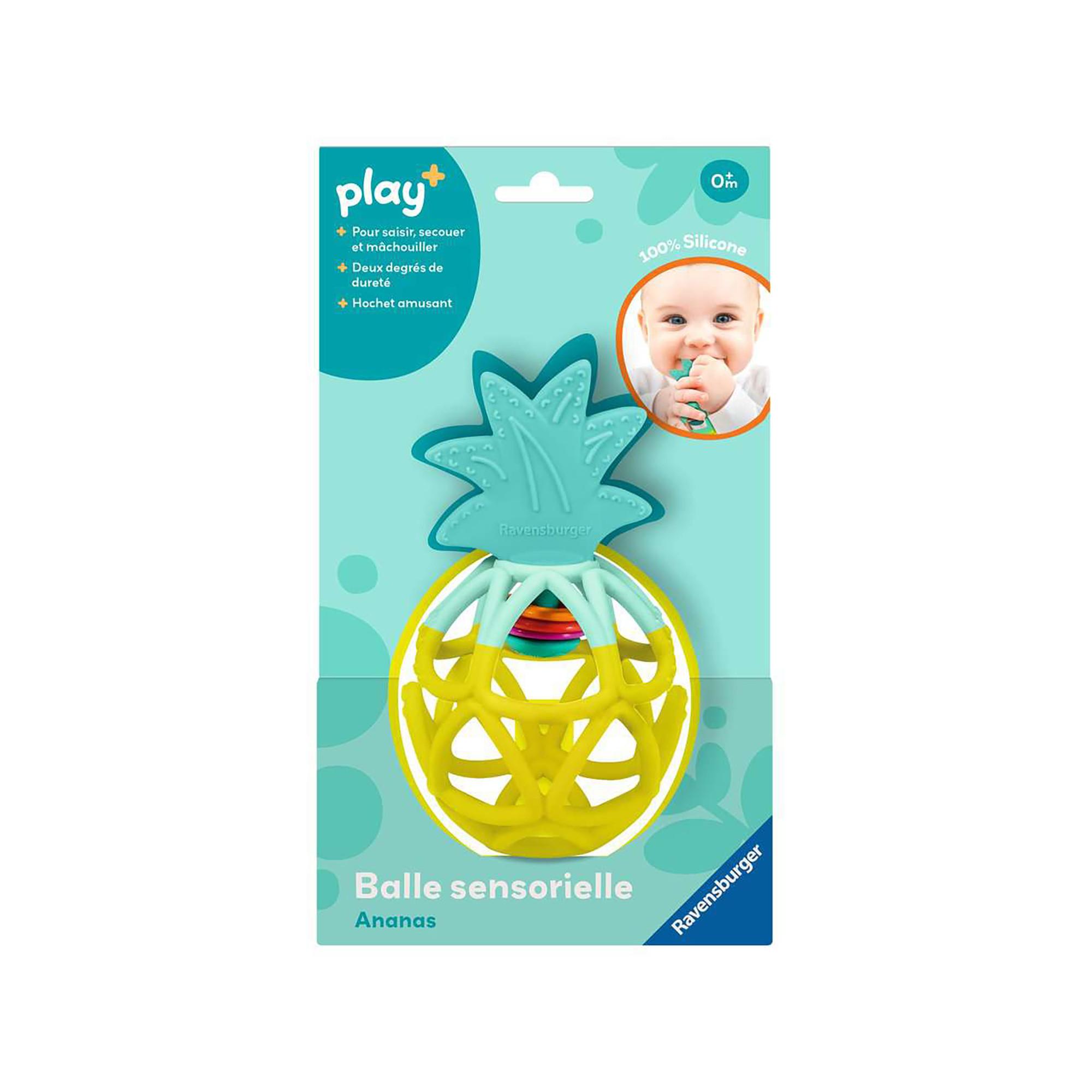 La balle sensorielle Ananas offre aux bébés beaucoup d’amusement ! A base de silicone souple, les bébés peuvent facilement attraper ce jouet multi sensoriel, le faire rouler et le lancer. Son design incite le bébé à jouer, et à développer sa motricité fine. Elle peut être nettoyée au lave vaisselle. Elle est coiffée d’une feuille de dentition, qui va accompagner les bébés lors des poussées dentaires ainsi qu’apaiser leurs gencives. Avec notre nouvelle gamme de jouets et de livres Play+ pour les enfants de 0 à 3 ans, nous proposons des produits adaptés à la petite enfance combinée à l’expérience de Ravensburger. Développés avec l'exigence de qualité de Ravensburger, nos livres et jouets plaisent aux enfants tout en leur permettant d'apprendre et de découvrir en s'amusant.Notre approche du jeu nous a amené à définir une gamme qui répond également aux besoins des parents, et chaque produit a un « plus » !
