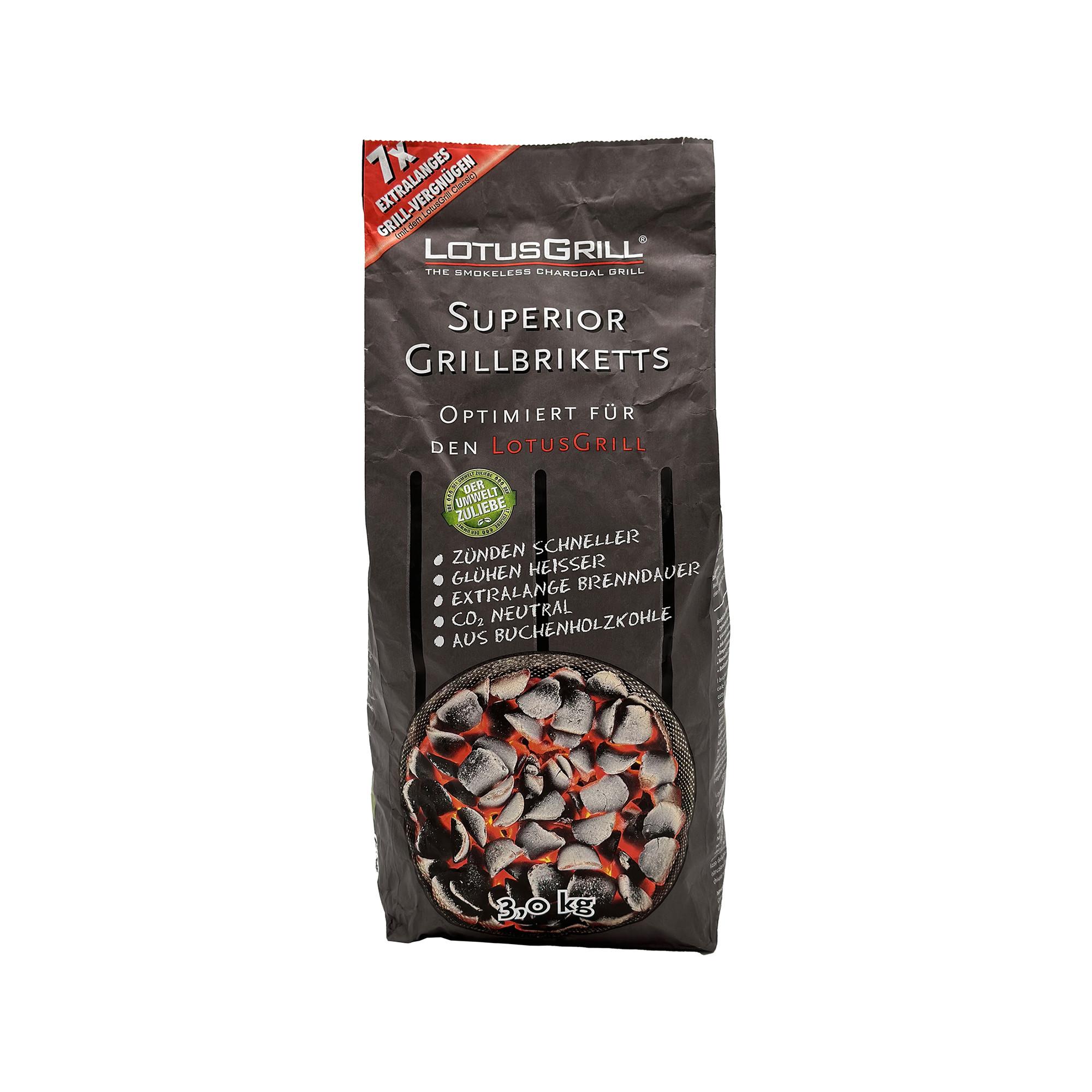 Briquettes de barbecue, optimisées pour le LotusGrill. En bois de hêtre, durée de combustion extra-longue.