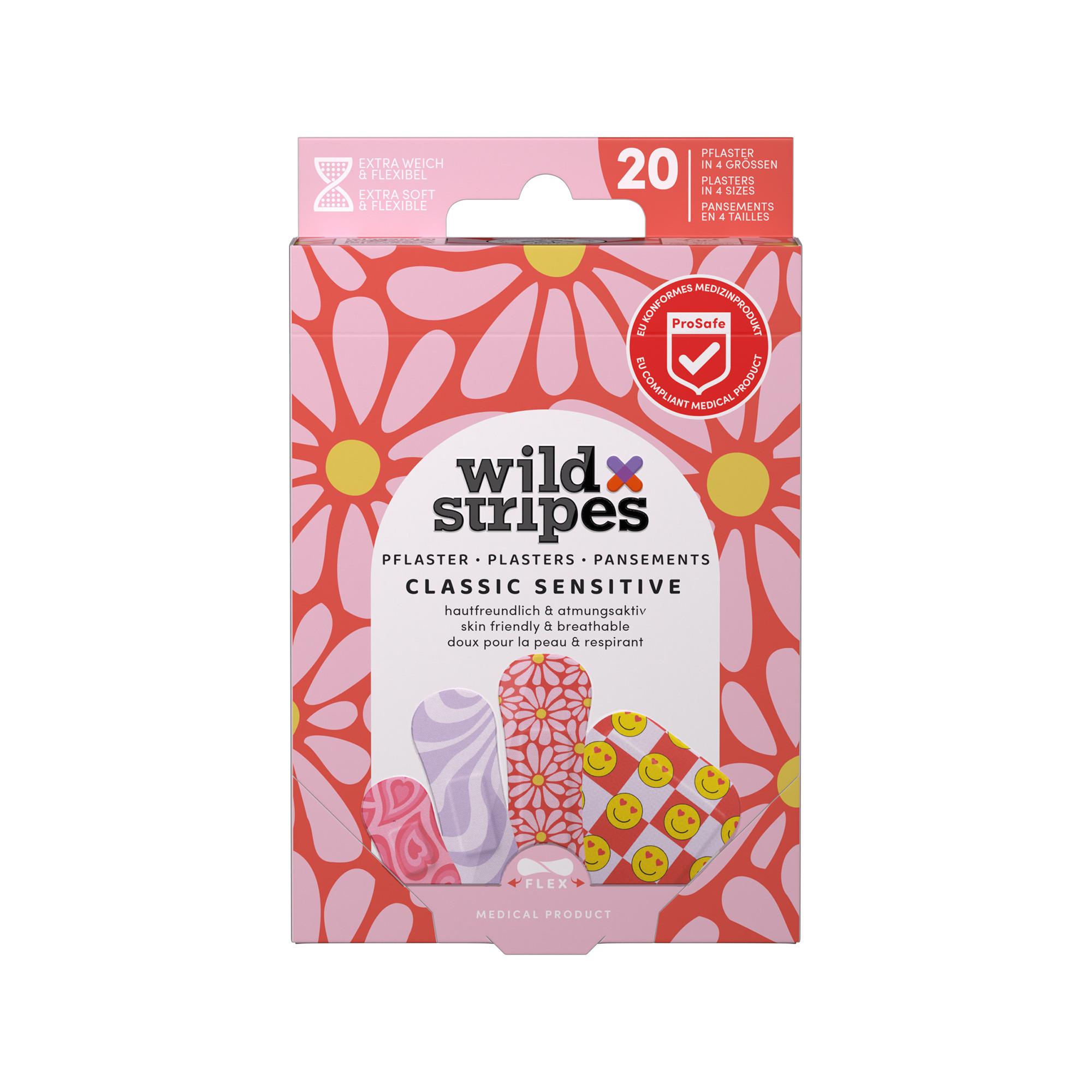 Bonne humeur garantie ! Wild Stripes – Classic Sensitive Pastel Fun est votre pansement conforme aux normes européennes qui offre plus qu'une simple protection. Notre patch est hypoallergénique et doux pour la peau et offre une très forte adhérence contre la saleté et les bactéries. Il est résistant à l’eau et peut être porté jusqu’à 24 heures, ce qui le rend indolore à retirer. Nos designs uniques et nos formes brevetées offrent une protection élégante pour les petites blessures.