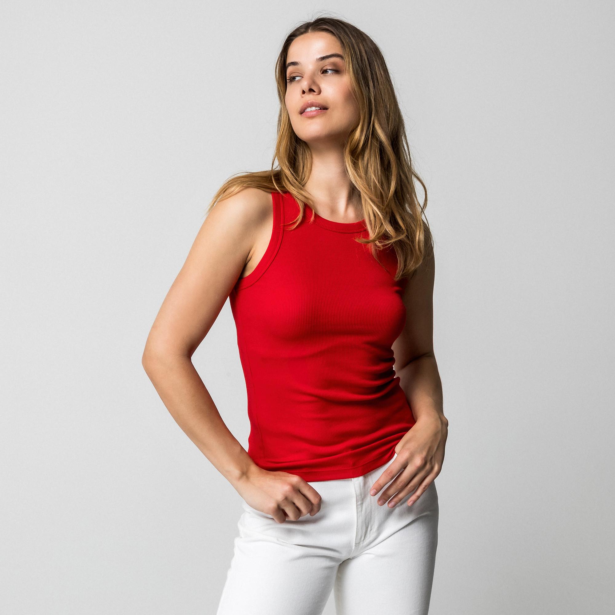 Ce débardeur est fabriqué en jersey de coton agréablement léger qui assure le confort de port élevé. Le haut côtelé à coupe droite est disponible dans différentes couleurs tendance.