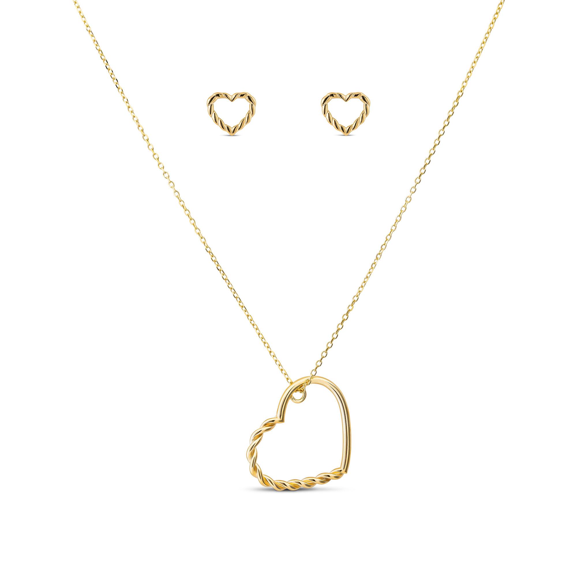 Cet ensemble de bijoux de L’Atelier Gold 18 carats by Manor est le cadeau parfait pour les moments spéciaux de la vie. Il d’une chaîne en filigrane avec un pendentif en forme de cœur et des boucles d’oreilles assorties avec des fermetures papillon.