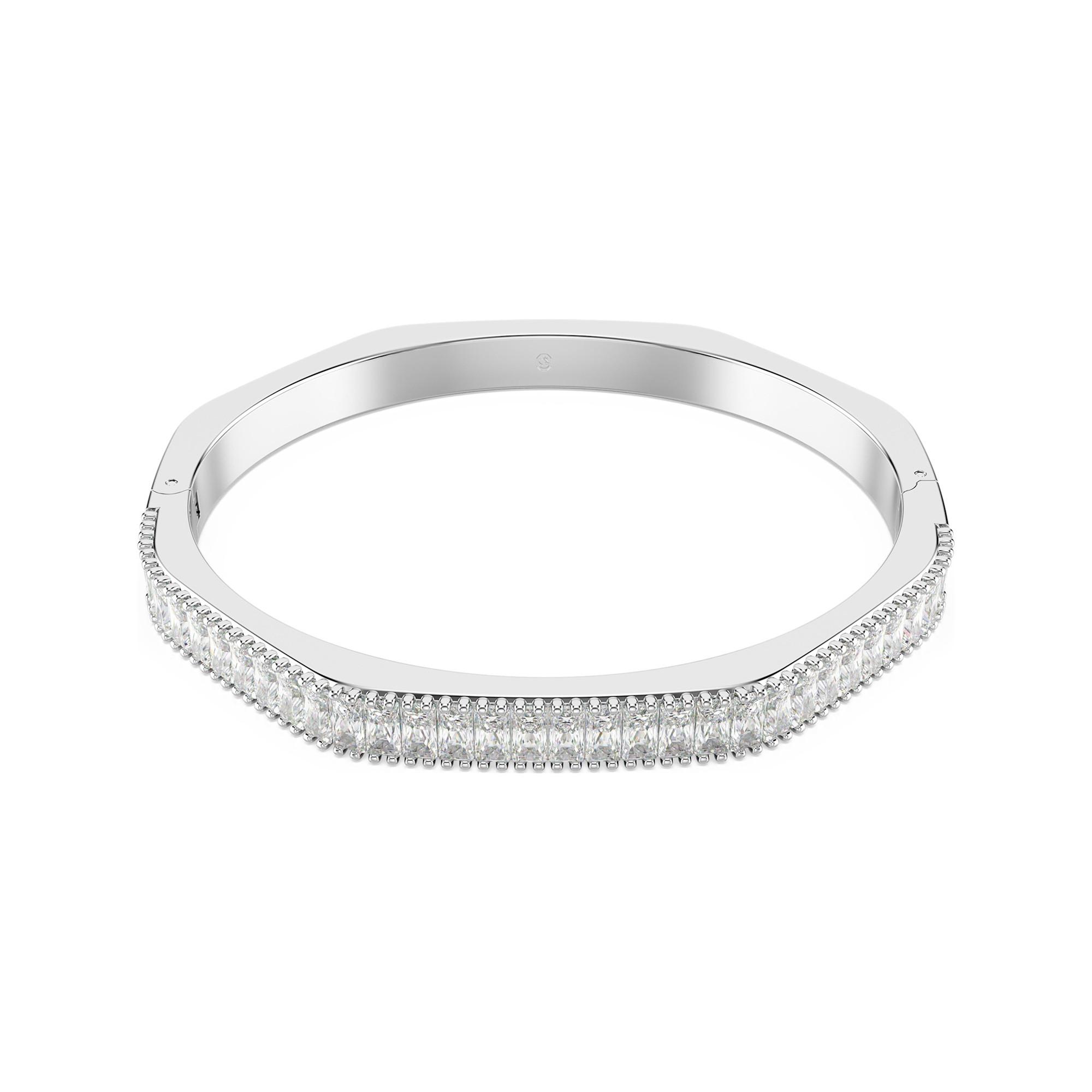 Ce bracelet Matrix avec une charnière ingénieuse apporte une joie enflammée dans chaque jour. Le design rhodié rayonne avec l'octogone caractéristique de Swarovski, décoré avec une pierre de zirconium Swarovski claire dans une taille baguette qui est très ludique et verticale