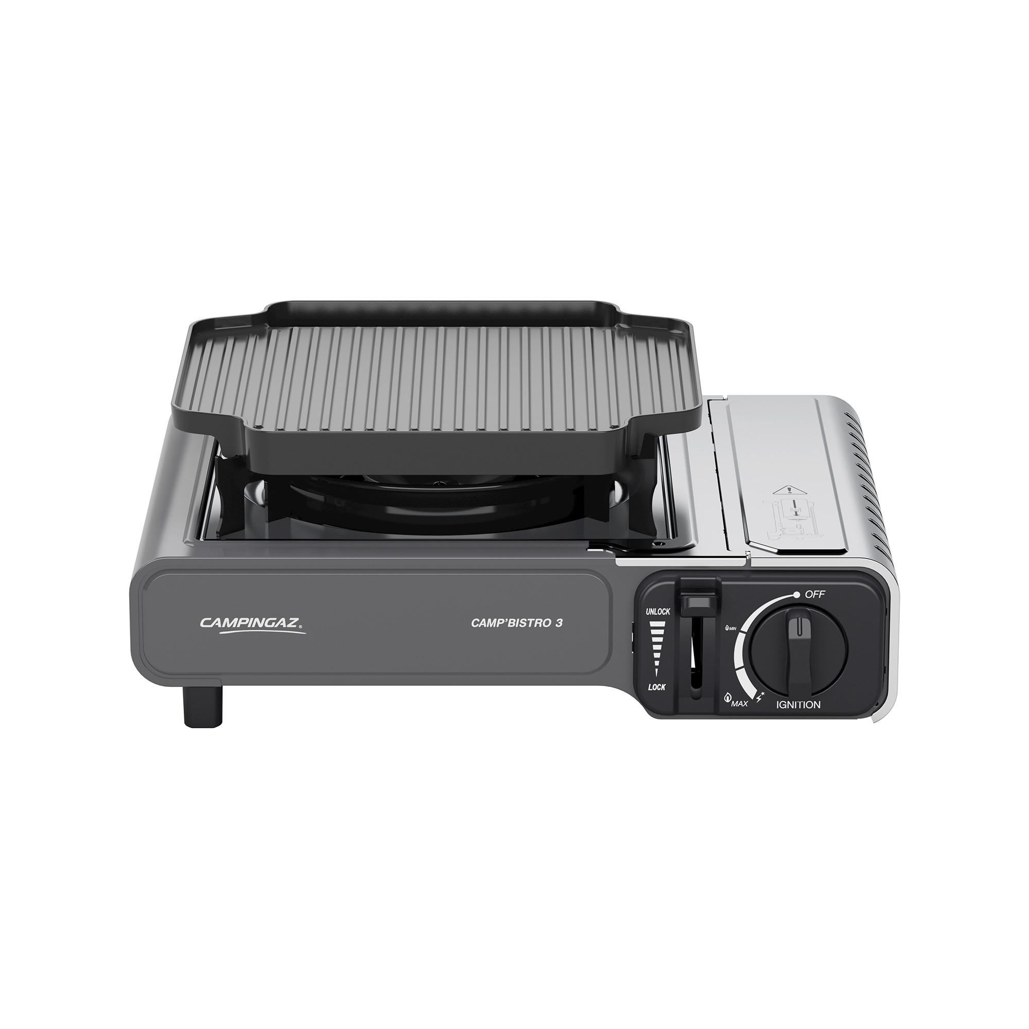 Le nouveau Camp’Bistro 3 se présente dans un design plus compact et plus léger, il comporte un support de casseroles revue qui est encore plus facile et plus commode à manipuler que celui du modèle prédécesseur. Il est parfait pour les excursions d’une journée, les pique-niques ou le camping. Le poêle fonctionne avec la cartouche Campingaz CP 250. Celle-ci peut être facilement rangée et connectée dans le compartiment latéral du poêle. Le système « Safety-Lock » permet une manipulation en toute sécurité. Pour un transport facile et un stockage en toute sécurité, le poêle est livré dans un coffret en plastique. Le Camp’Bistro 3 a été testé et est conforme à la norme européenne EN17476:2021. Nouveauté cette année, le Camp’Bistro 3 avec plaque grill !