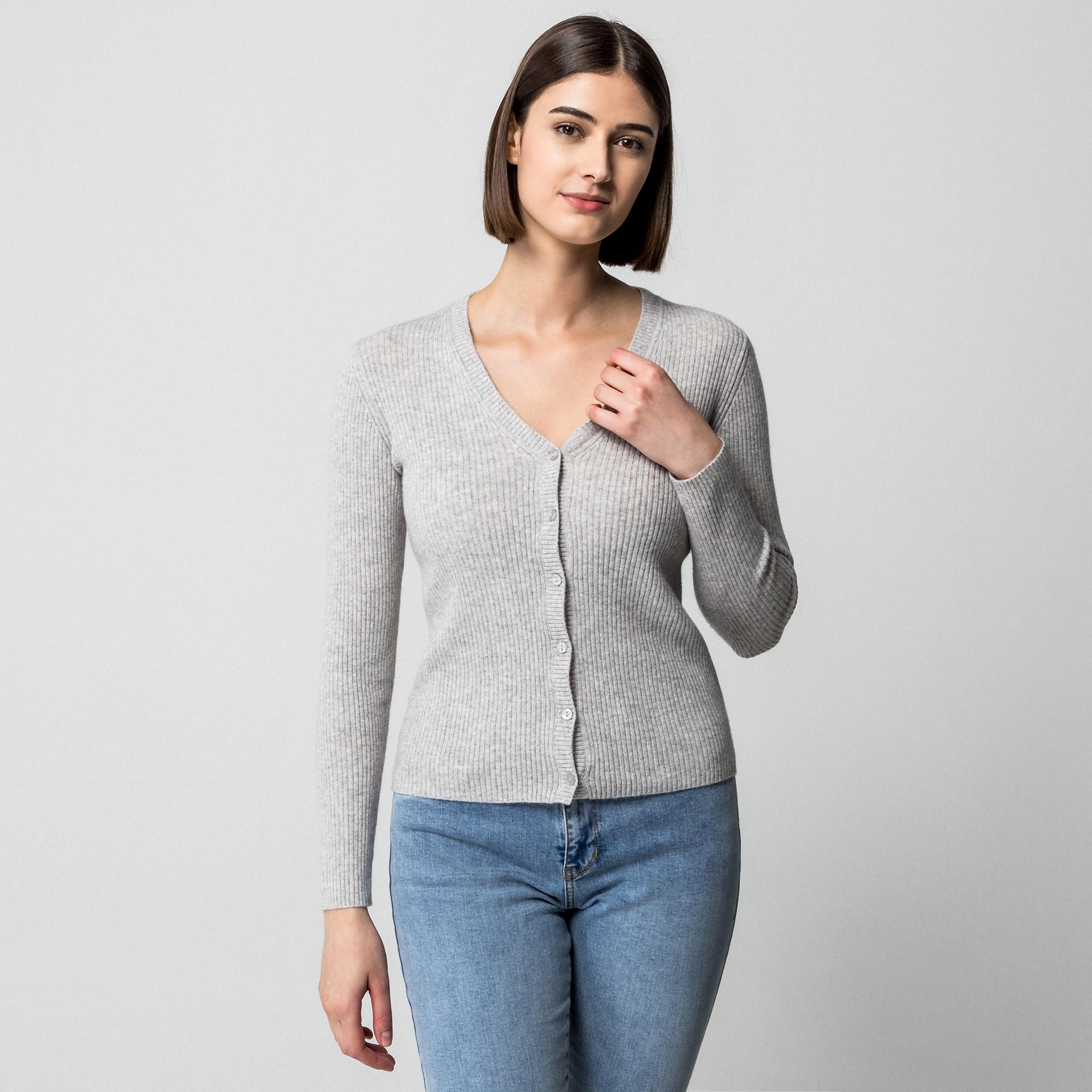 Ce cardigan est fabriqué en pure laine de cachemire. Le cardigan en maille côtelée classique avec une encolure en V et des manches longues a une coupe droite et ajustée – un basique polyvalent de tous les jours avec une silhouette féminine.