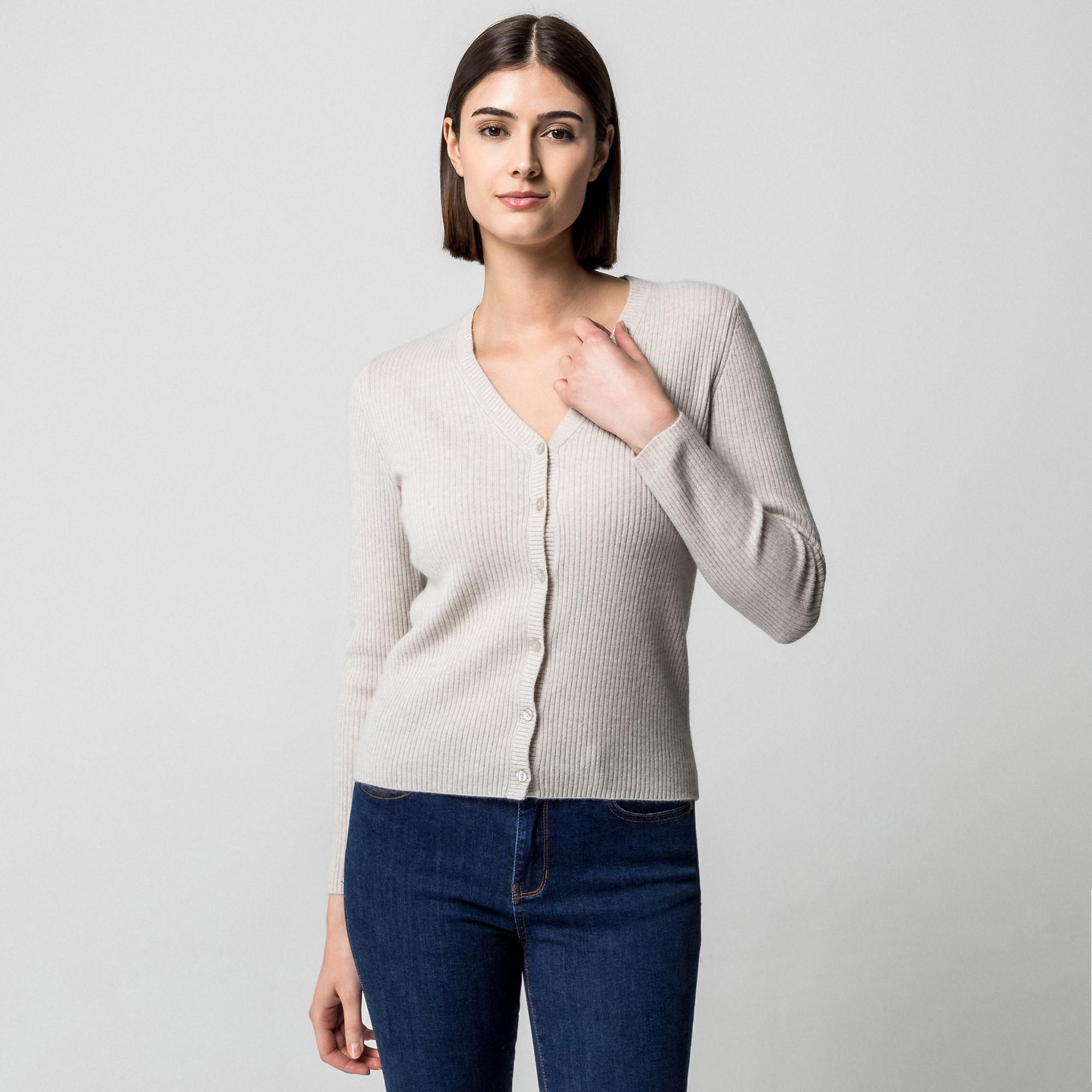 Ce cardigan est fabriqué en pure laine de cachemire. Le cardigan en maille côtelée classique avec une encolure en V et des manches longues a une coupe droite et ajustée – un basique polyvalent de tous les jours avec une silhouette féminine.