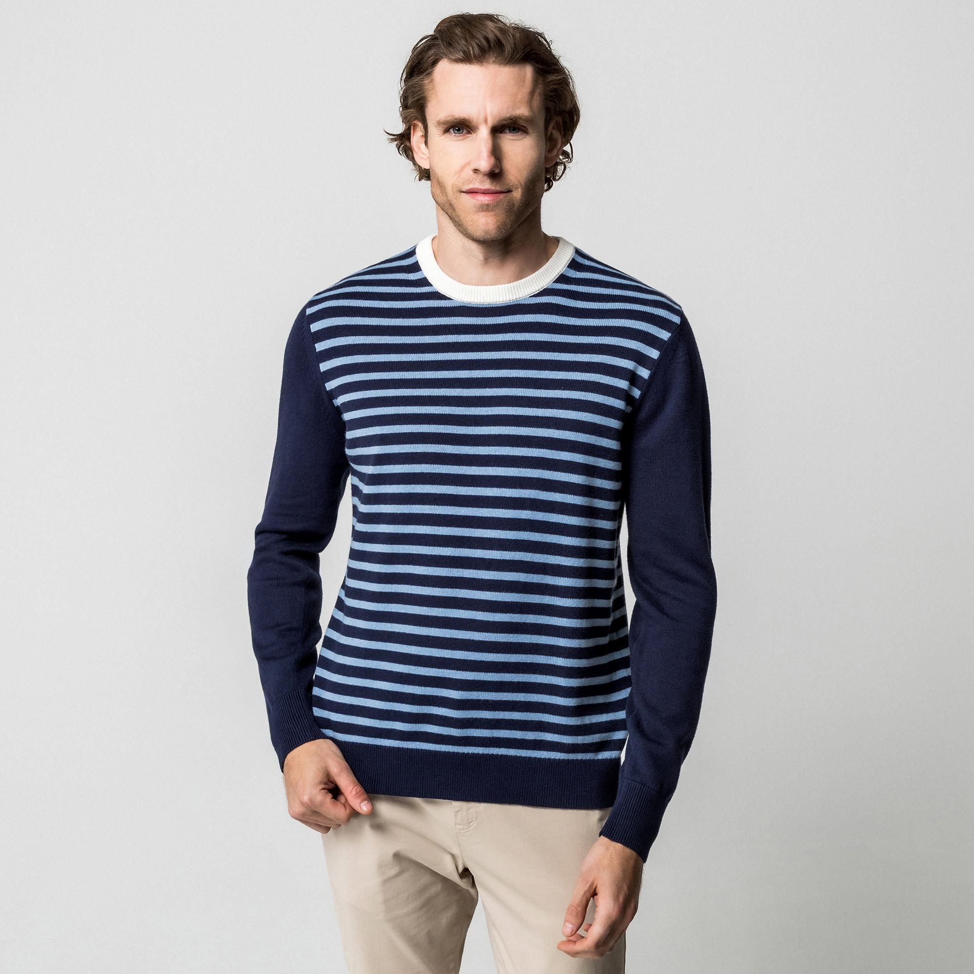 Ce pull convainc par un tricot fin et une encolure ronde classique contrastée. Le motif à rayures subtiles ajoute une touche dynamique au design, tandis que les bords-côtes aux manches et à l'ourlet assurent un ajustement confortable. Un compagnon élégant pour le quotidien.