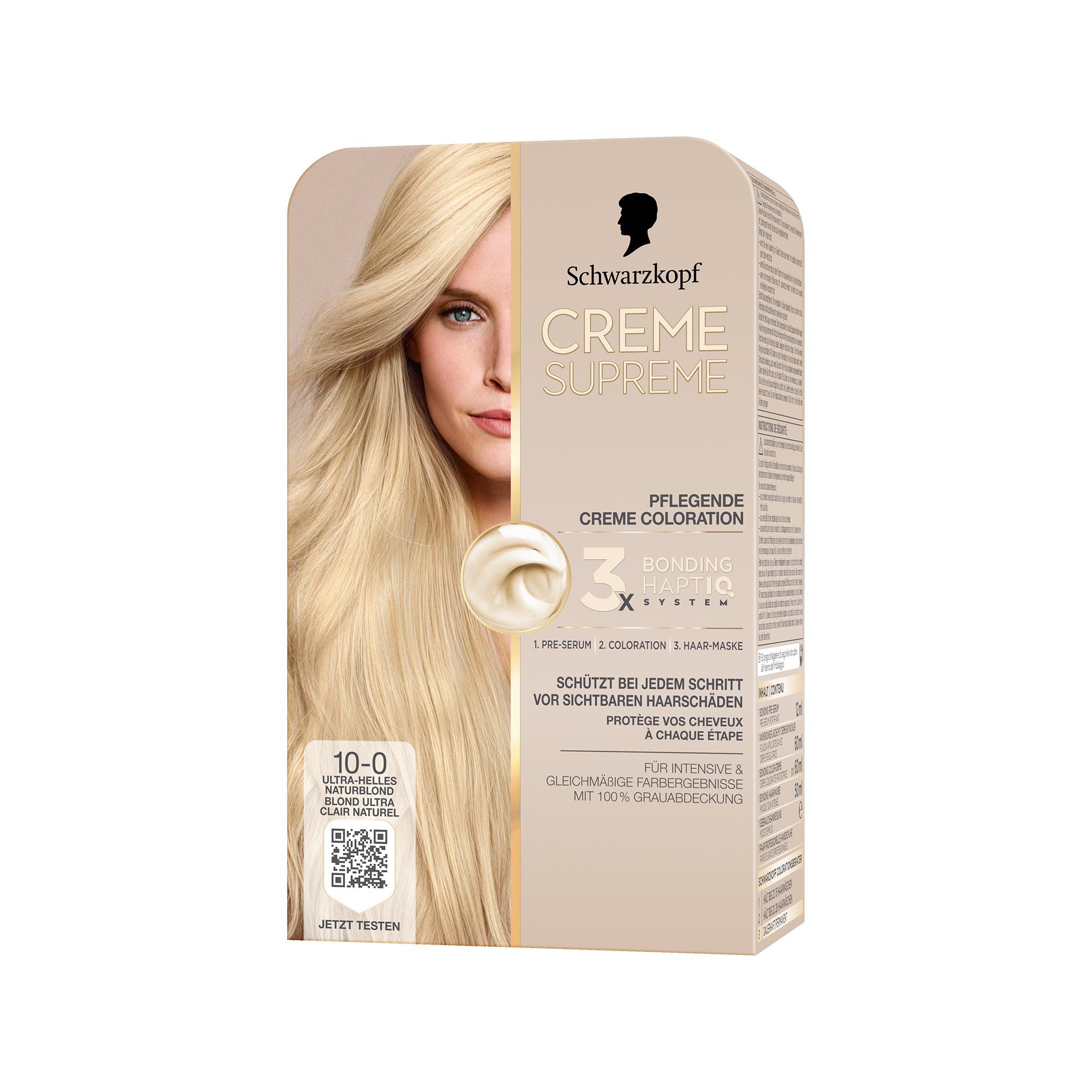Schwarzkopf Creme Supreme Coloration 10-0 Blond naturel ultra clair (182 ml), coloration permanente avec sérum et masque capillaire protège des dommages visibles des cheveux, pour une couverture à 100% des cheveux gris.