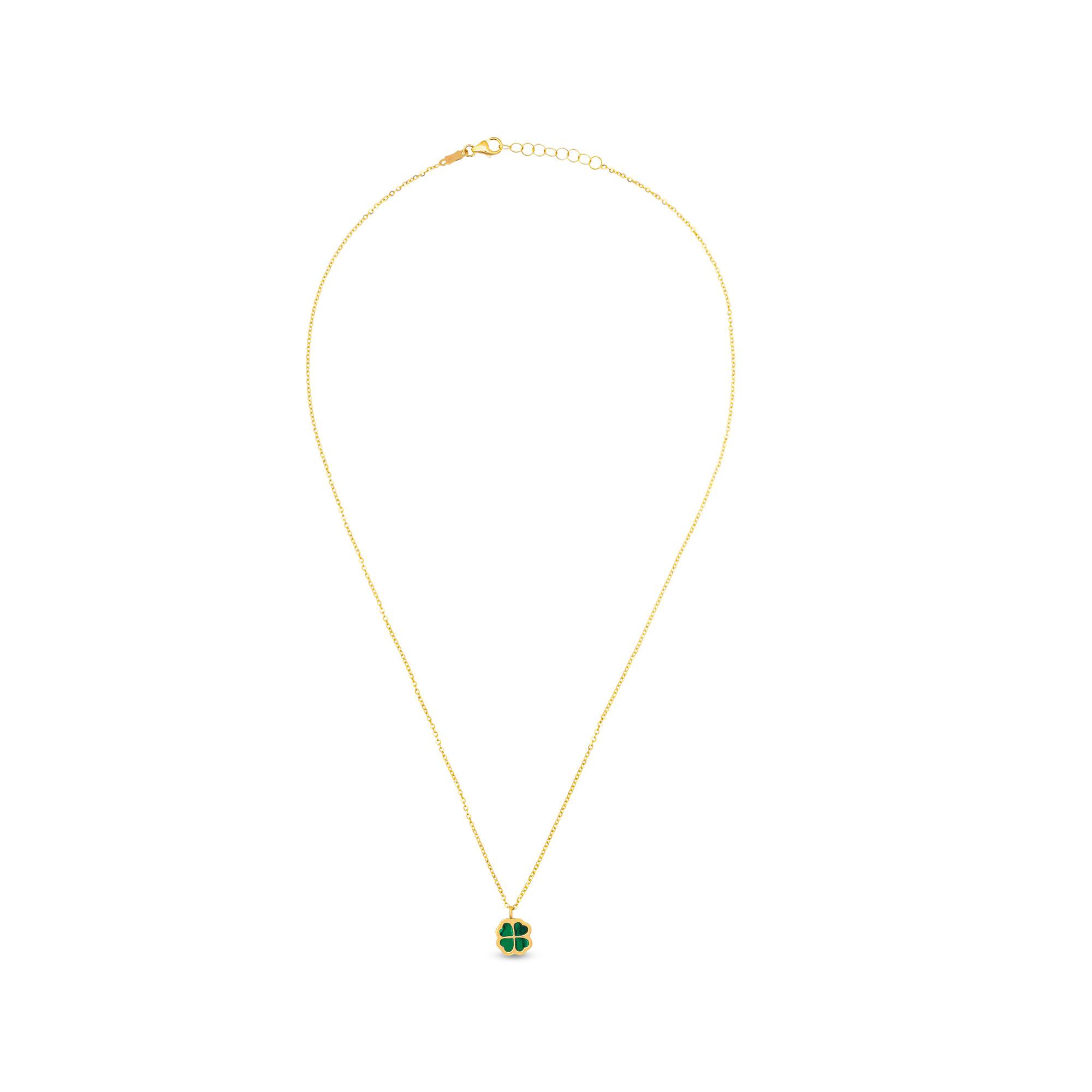Cette chaîne en filigrane avec pendentif de L'Atelier Gold 18 Karat by Manor est en or jaune. Le délicat pendentif en feuille de trèfle en malachite porte chance, sans aucun doute. Le bijou est de largeur réglable et se ferme par un mousqueton.