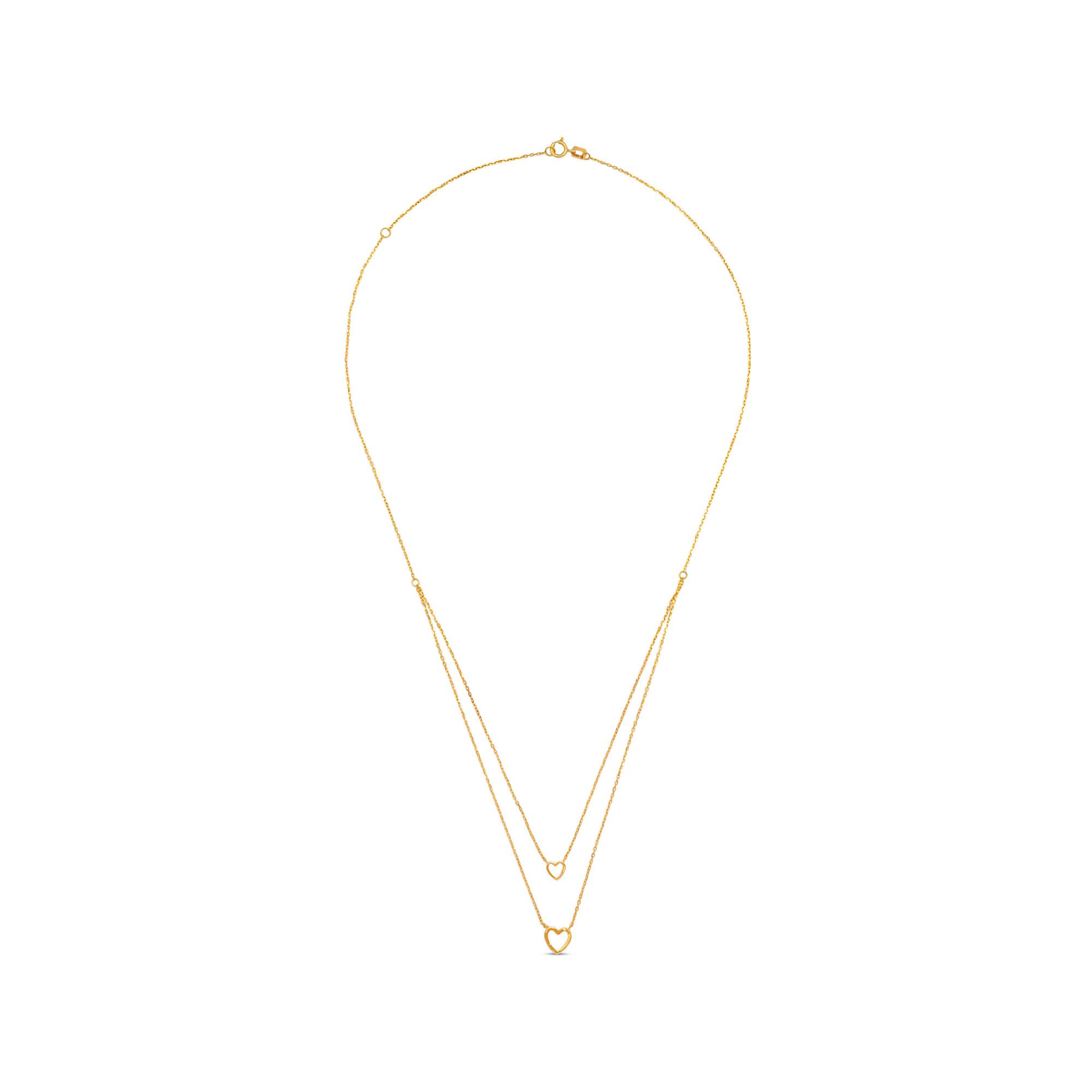 Cette chaîne en filigrane avec une paire de pendentifs en forme de cœur de L'Atelier Gold 18 Karat by Manor est en or jaune. Le bijou est de longueur réglable et se ferme par une fermeture à ressort.