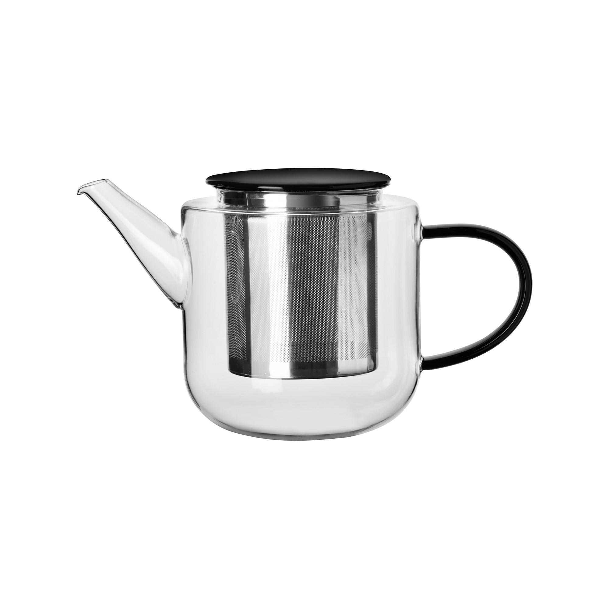 Élégante théière en verre borosilicaté fin avec une poignée noire semi-transparente stylée et un couvercle en porcelaine assorti. Le filtre en acier inoxydable de haute qualité à la structure fine garantit une préparation parfaite et un plaisir de dégustation incomparable.