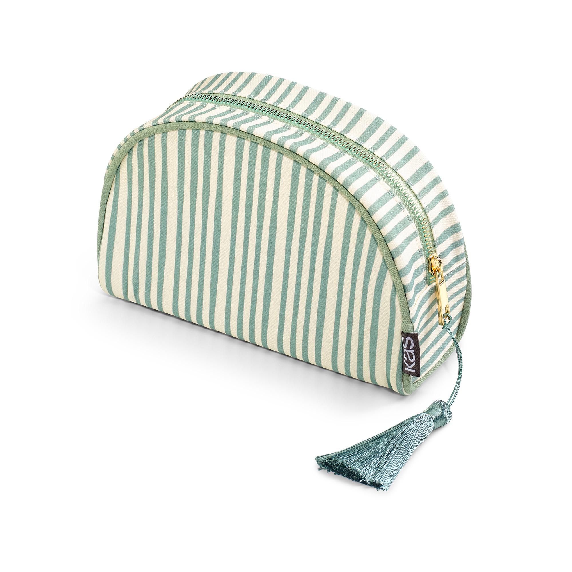 Avec son design moderne à rayures et sa forme ronde élégante, cette trousse de toilette KAS apporte style et ordre dans votre sac. La fermeture éclair dorée avec un pompon de couleur assortie complète le design - pratique, compacte et idéale pour les cosmétiques et les petits essentiels en déplacement.