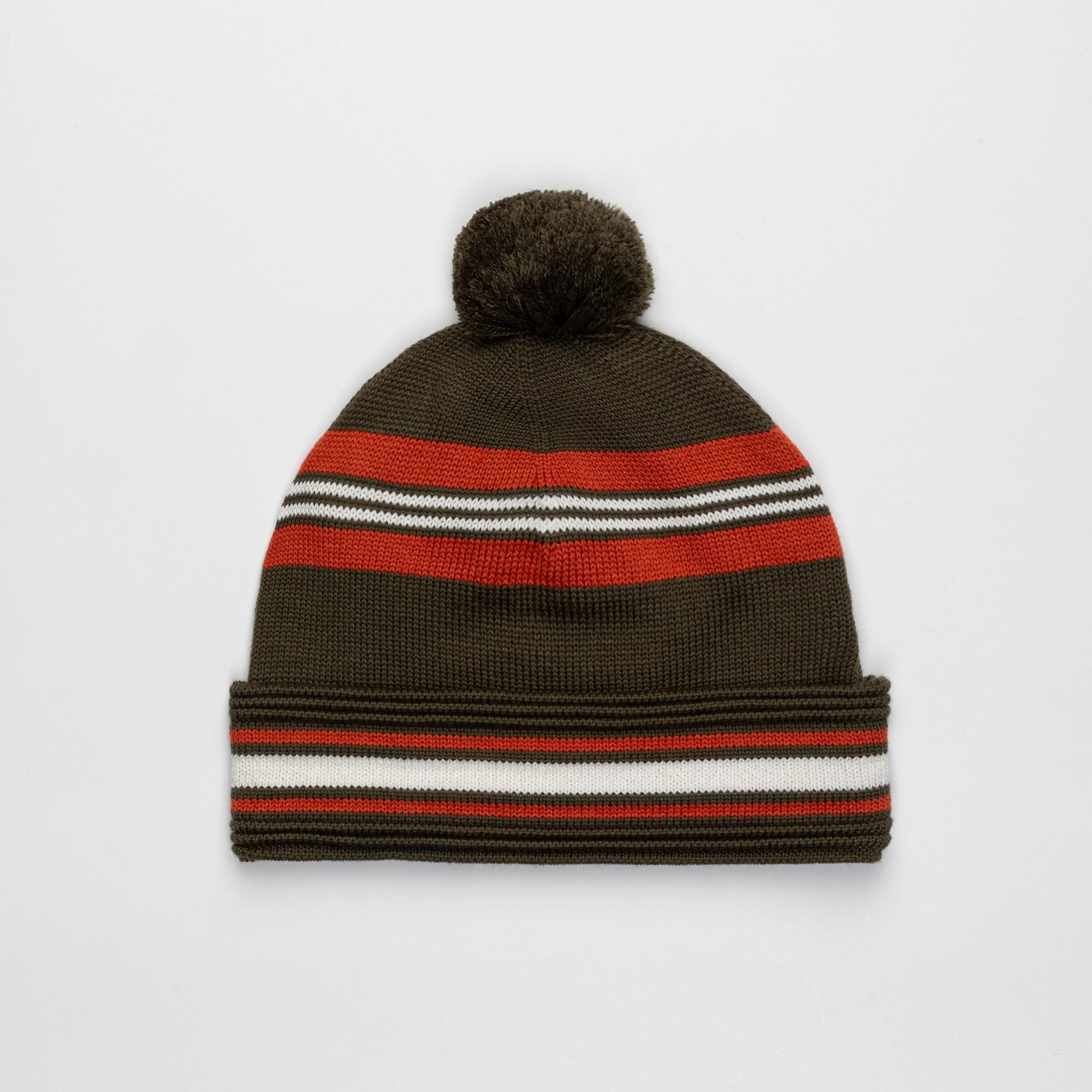 Ce bonnet est confectionné dans un mélange de laine, avec un design rayé classique et un pompon ludique. L'accessoire en maille fine est léger et doux, assurant une expérience de port particulièrement agréable.