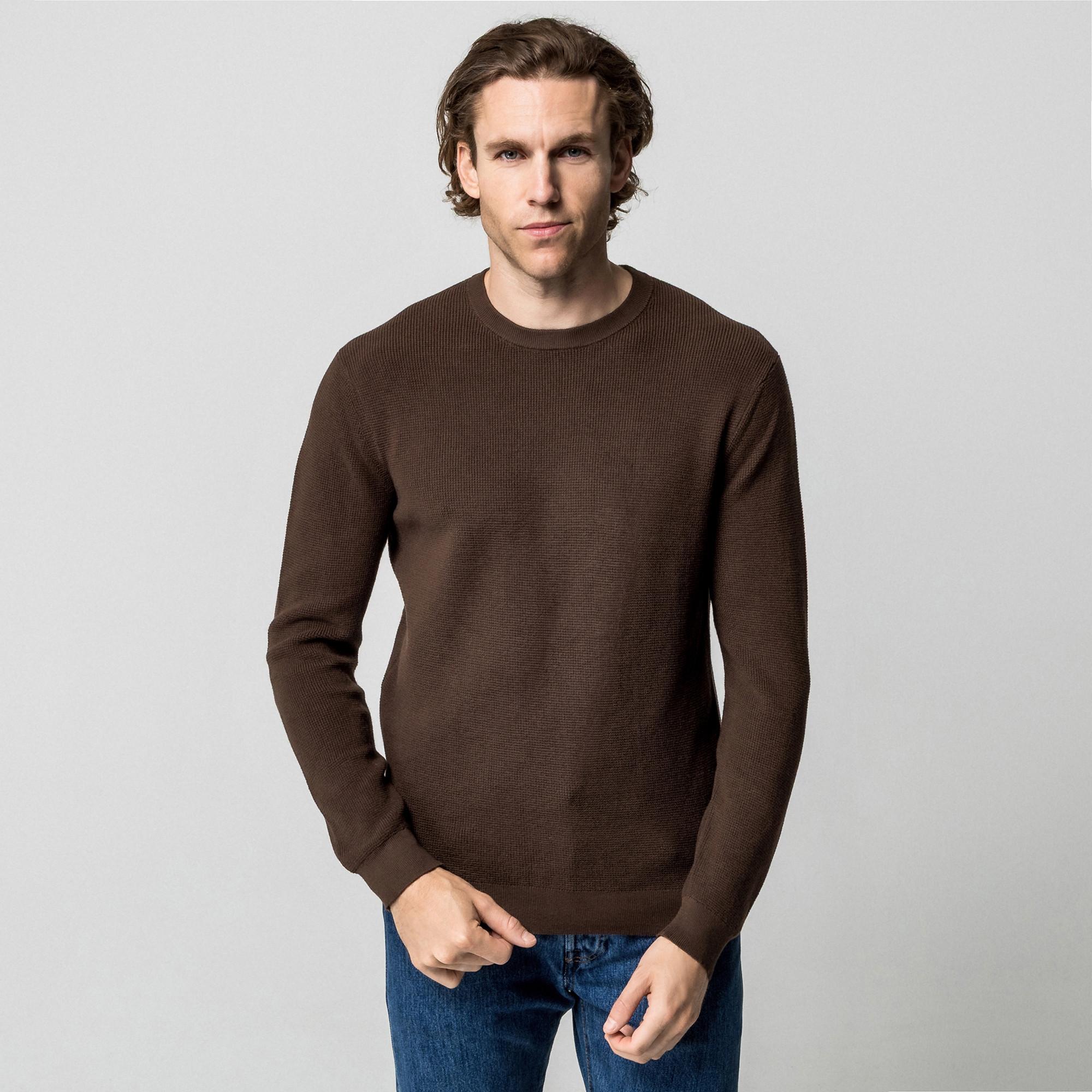 Ce pull est confectionné dans un mélange de coton agréablement doux. Le pull en tricot est confectionné dans un piqué gaufré classique avec une encolure ronde, des manches longues et des bordures en tricot côtelé.