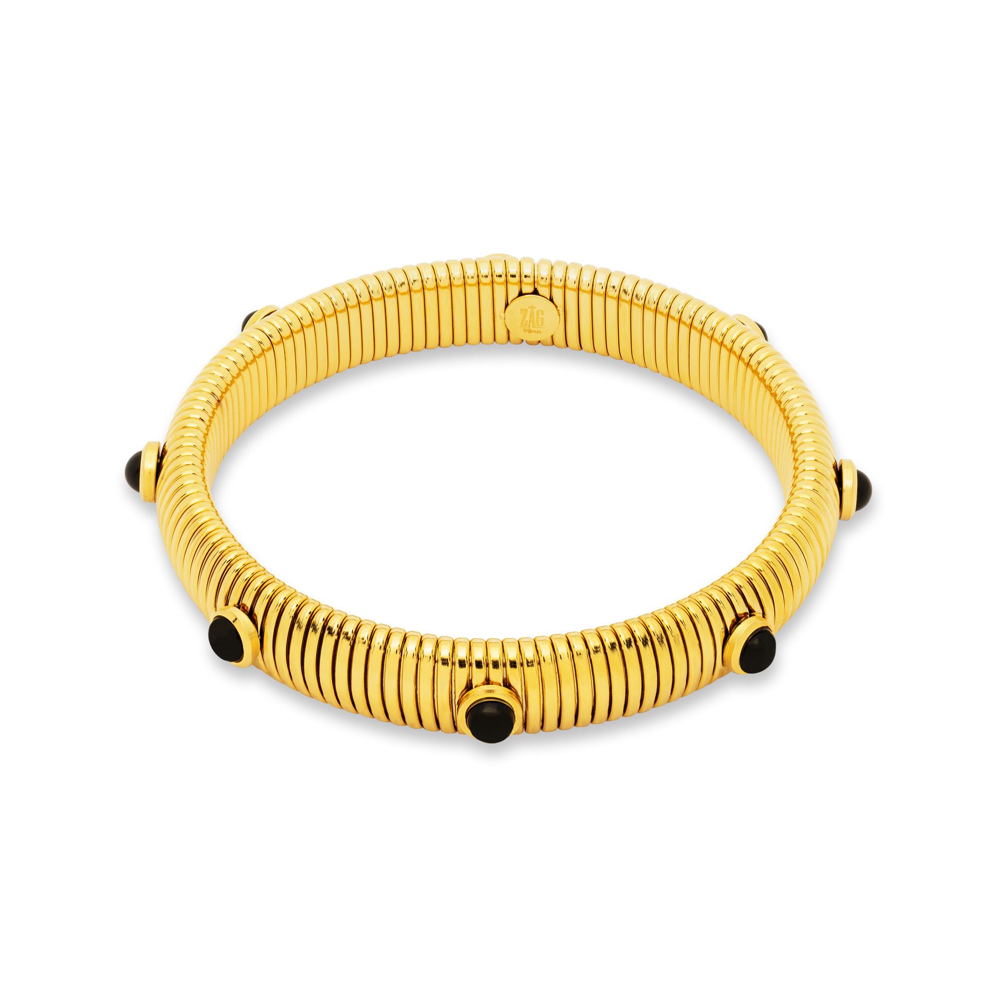 Ce bracelet en acier inoxydable avec onyx de Zag Bijoux combine la brillance dorée du métal avec le noir profond de l’onyx – le chic urbain rencontre l’élégance. Flexible et confortable au poignet, il est une affirmation de style