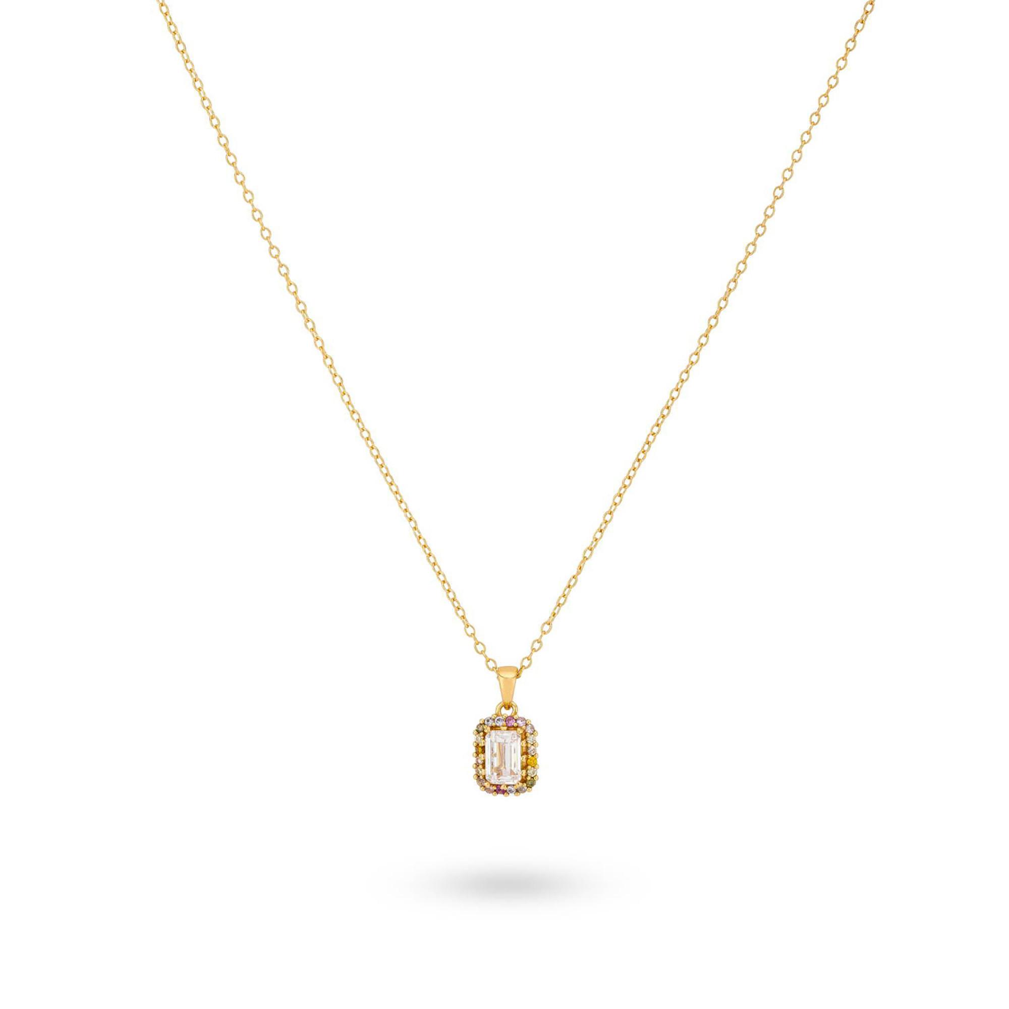 Cette élégante chaîne de 24Kae présente un pendentif d’inspiration vintage avec un zirconium blanc rectangulaire au milieu,