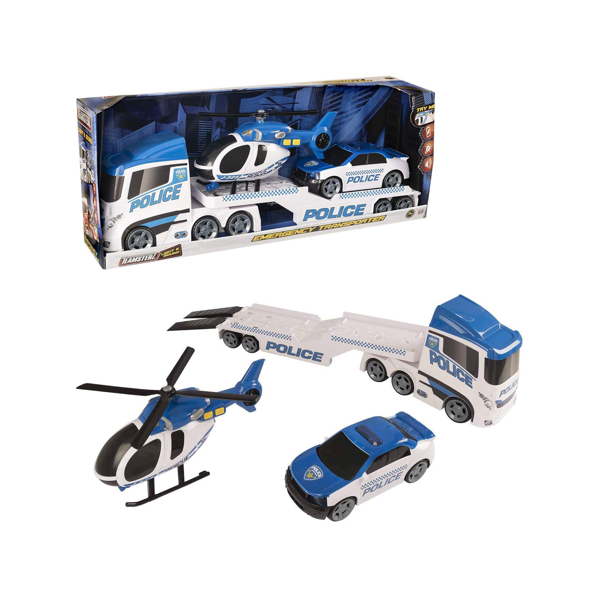 Convient aux enfants de 3 ans et plus.Comprend le Teamsterz Police Heli Transporter avec un hélicoptère et un véhicule de police.Fourni avec des décalcomanies de police d'urgence.L'hélicoptère comporte des pales rotatives à mouvement manuel.Le Police Heli Transporter comporte une rampe à mouvement manuel.Lumières et sons authentiques, y compris le moteur, la sirène, le rotor et l'action.Roues à mouvement libre pour s'amuser à pousser.Nécessite 3 piles AAA (incluses).Corps moulé sous pression avec détails moulés sous le corps.Favorise le développement cognitif et social de votre enfant.Les enfants ont besoin d'un équipement et d'une technologie de pointe.